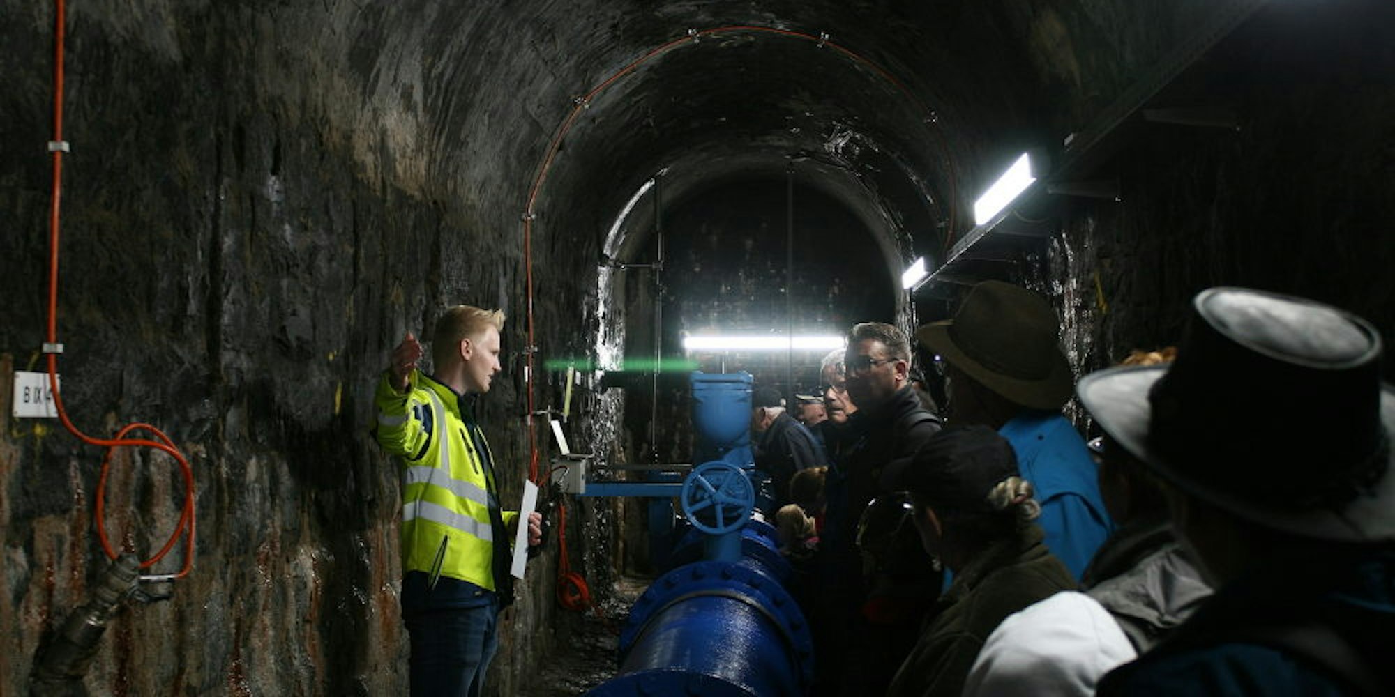 Auch die Grundablassleitung in 60 Metern Tiefe der Bogenmauer besichtigten die Besucher mit Stefan Neue (l.).