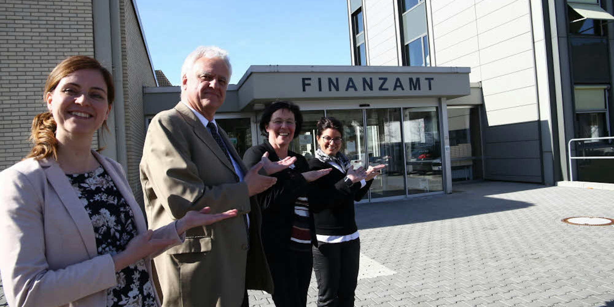 Gut sichtbar ist das Finanzamt in Gemünd nun dank des Schriftzugs über dem Eingang. Die Neuerungen zeigen Christine Müller (v.l.), Wolfgang Röhrig, Nicole Heinen und Heike Ungermann.