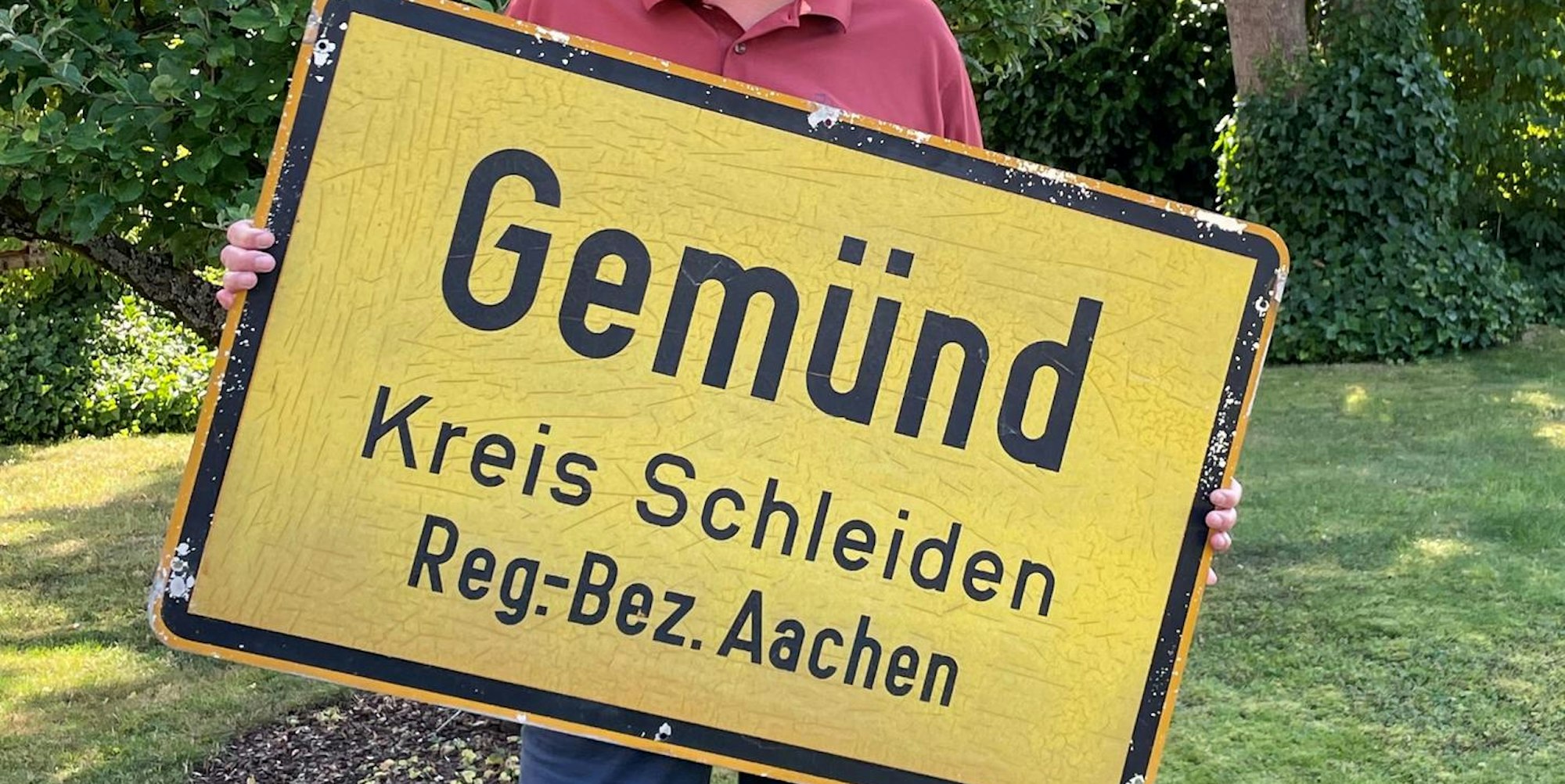 Viele, aber eben nicht alle. In einem Innenhof, auf etwa 1,80 Meter Höhe, gleich hinter den Wänden der Redaktion, hat ein solches Schild den Fluten getrotzt. „Gemünd – Kreis Schleiden – Regierungsbezirk Aachen“, so steht da drauf. Es gehört Markus Herbrand, FDP-Bundestagsabgeordneter und Gemünder durch und durch, wie er selbst sagt. „Eigentlich gehörte es meinem Vater“, sagt Herbrand. Jahrelang habe es in der Garage gelegen, irgendwann hing sein Vater das knapp einen Meter breite und 85 Zentimeter hohe Schild an die Wand im Hof des Elternhauses. Mittlerweile hängt es dort nicht mehr, sondern liegt bei Herbrand in der Garage. „Das ist das Einzige, was ich aus dem alten Haus beim Verkauf mitgenommen habe“, so Herbrand. „Es ist ein historisches Dokument, man interessiert sich für solche Stücke.“