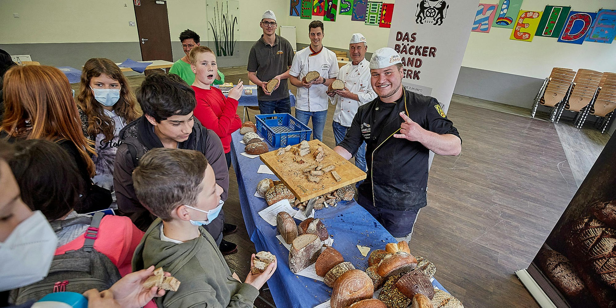 Schleiden – Hell, dunkel, würzig, mild, aber immer lecker, so ist das Brot der Eifeler Bäckereien. Wie lecker, das sah man den Schülerinnen und Schülern der Schleidener Realschule deutlich an, die sich nach der Brotprüfung in ihrer Schule auf die Backwaren stürzen durften. Serviert wurden ihnen diese von Innungsobermeister Siegwin Zimmer, dessen Sohn Patrick und dem Gesellen Dennis Knobloch.