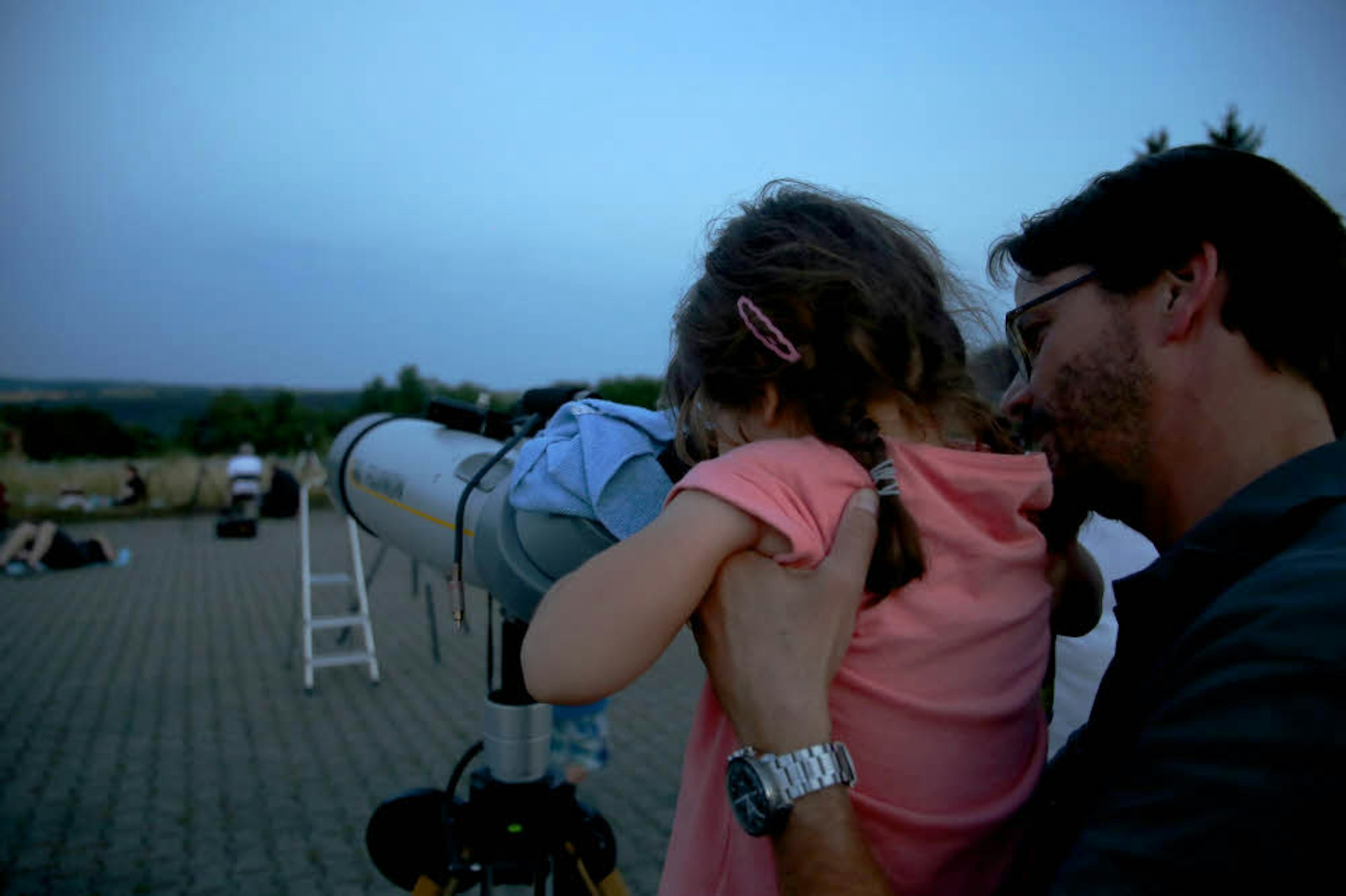 Rund 140 Besucher waren auf das Areal an der alten Tankstelle in Vogelsang gekommen, wo Bardenhagen mit seinen Teleskopen stand. Um sie alle betreuen zu können, wurde er von Bernward Jost und Shahab Noorani unterstützt. Zehn Teleskope und Ferngläser hatten sie aufgebaut – und ausreichend Leitern, um auch den Kindern einen Blick ins Okular zu ermöglichen.