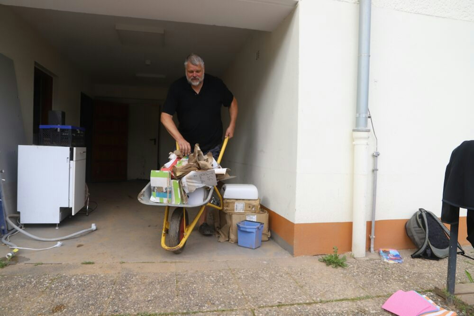 Schubkarrenweise fährt auch Schulleiter Georg Jöbkes zerstörte Bücher aus dem Gymnasium.