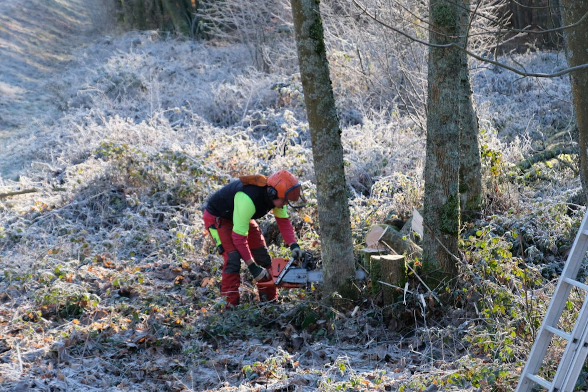 Mit der Motorsäge geht Marco Offermann an die Stämme, die vertrocknet sind und deshalb verschwinden müssen.