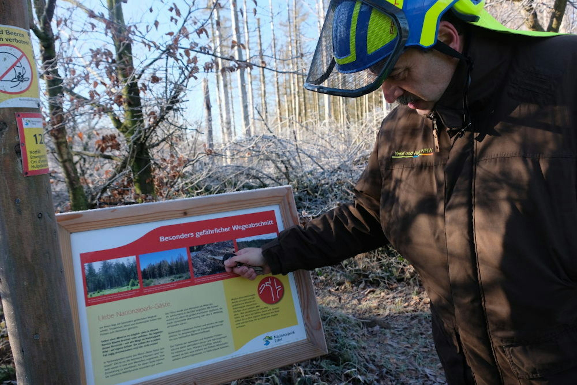 Noch bis Mitte März, so schätzen Düll und Pohl, werden die Fällarbeiten an der Kermeterhochstraße andauern. Mindestens 1000 Bäume werden dort gefällt, weil sie den Straßenverkehr unmittelbar gefährden oder weil Wanderer von herabfallenden Ästen getroffen werden könnten.