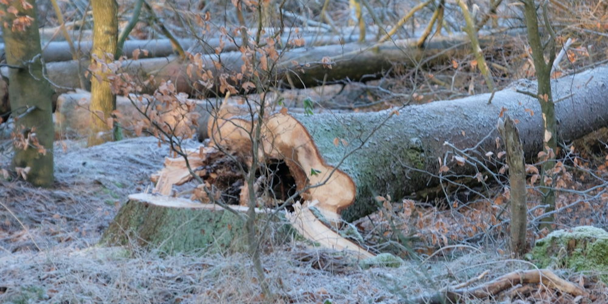 Die gerade gefällte Buche ist innen hohl. Sie könnte gerade noch so als Brennholz dienen. Doch der Baum bleibt liegen und soll zu Totholz werden. Das Holz wird nicht vermarktet.