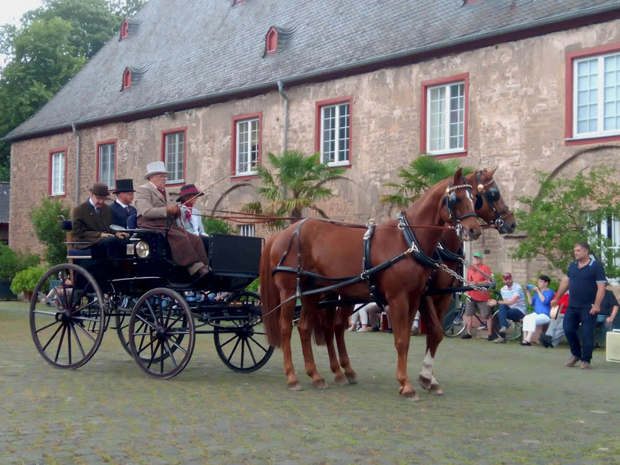 Wolters Kutsche, ein um 1900 gebauter Phaeton Stanhope der Firma Utermühle aus Hildesheim, war mit dabei. Als Begleiter fuhren Wolter, Britta Heiter, Thomas Hansen und Norbert Laukötter mit. An der Picknickstation am Forsthaus Buschhoven packte das Quartett den historischen Picknickkorb aus. Kutschenfahrer Wolter erklärte den neugierigen Zaungästen und den Besuchern der Veranstaltung auch gerne, dass seine Kutsche etwas ganz Besonderes ist. Denn der Phaeton Stanhope hat eine zum Aufsteigen nach hinten ausschwenkbare Sitzbank für Fahrgäste sowie einen eisernen Tritt – eine Art Aufstiegshilfe für den Groom. Dabei handelt es sich um einen Pferdeknecht, der in früheren Zeiten den Herrschaften bei einem Halt behilflich war. Schließlich wurde Wolters Kutsche nicht für irgendwen gebaut, sondern einst für das Hannoveranische Königshaus. In Salzburg hat der Dreiborner die Kutsche aufarbeiten lassen, sodass sie noch jahrelang halten wird, obwohl die wichtigen Teile tatsächlich schon fast 120 Jahre alt sind. Die Holzteile mussten wie die Polster erneuert werden.