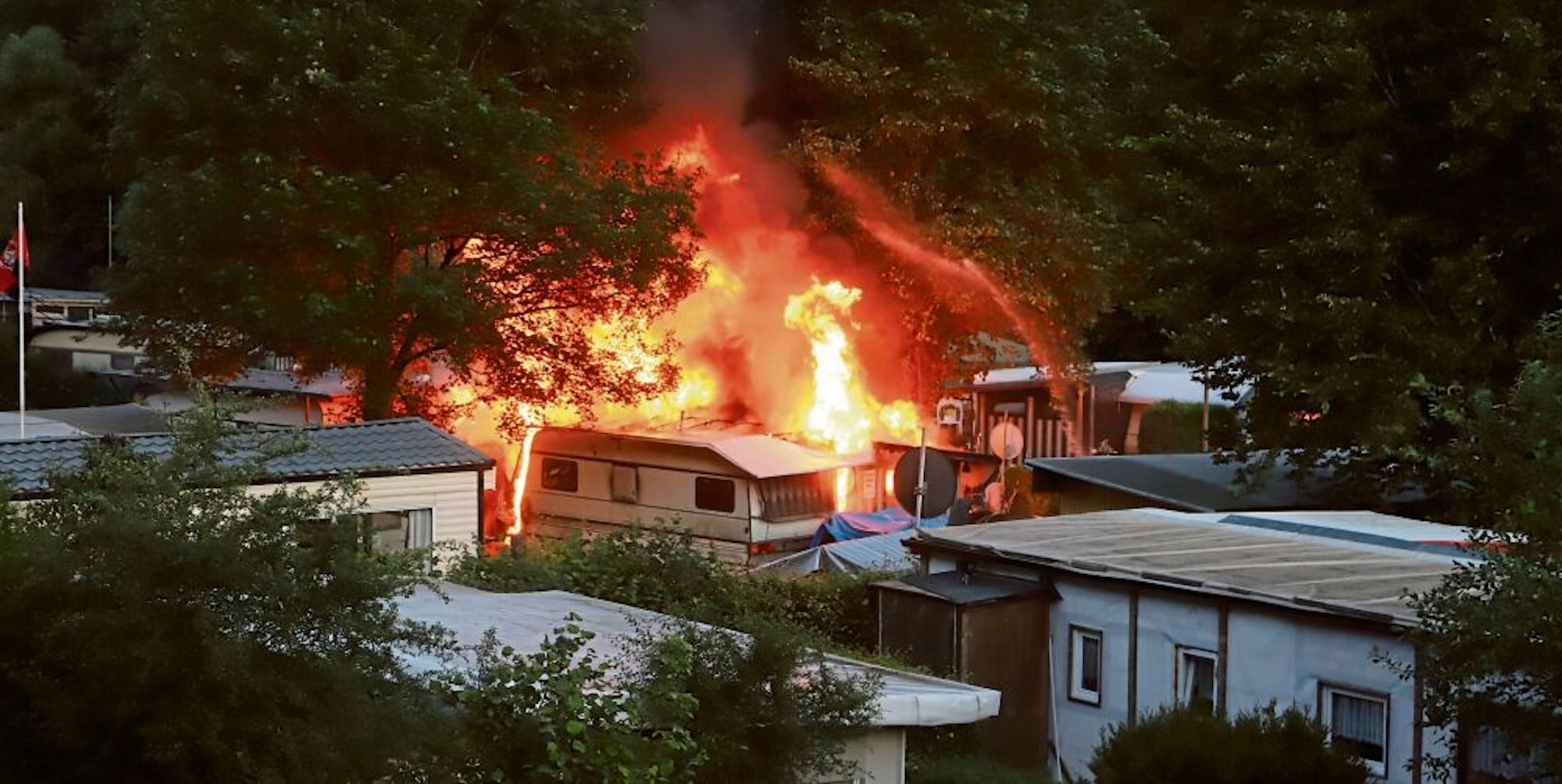 Zudem seien mehrere Gasflaschen explodiert. Wie ernst die Lage war, bestätigte Elmar Scholzen, Besitzer des Campingplatzes. In dem Schuppen, der direkt an dem brennenden Wohnwagen stand, seien insgesamt 14 Gasflaschen gelagert gewesen. „Das ist unverantwortlich, so viele Gasflaschen auf dem Gelände zu lagern“, monierte er.