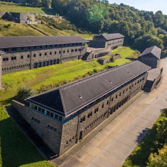 Die neuen Ferienhäuser und die Kasematten liegen am östlichen Rand von Vogelsang. Das große Gebäude im Hintergrund ist die ehemalige belgische Truppenunterkunft „Van Dooren“.