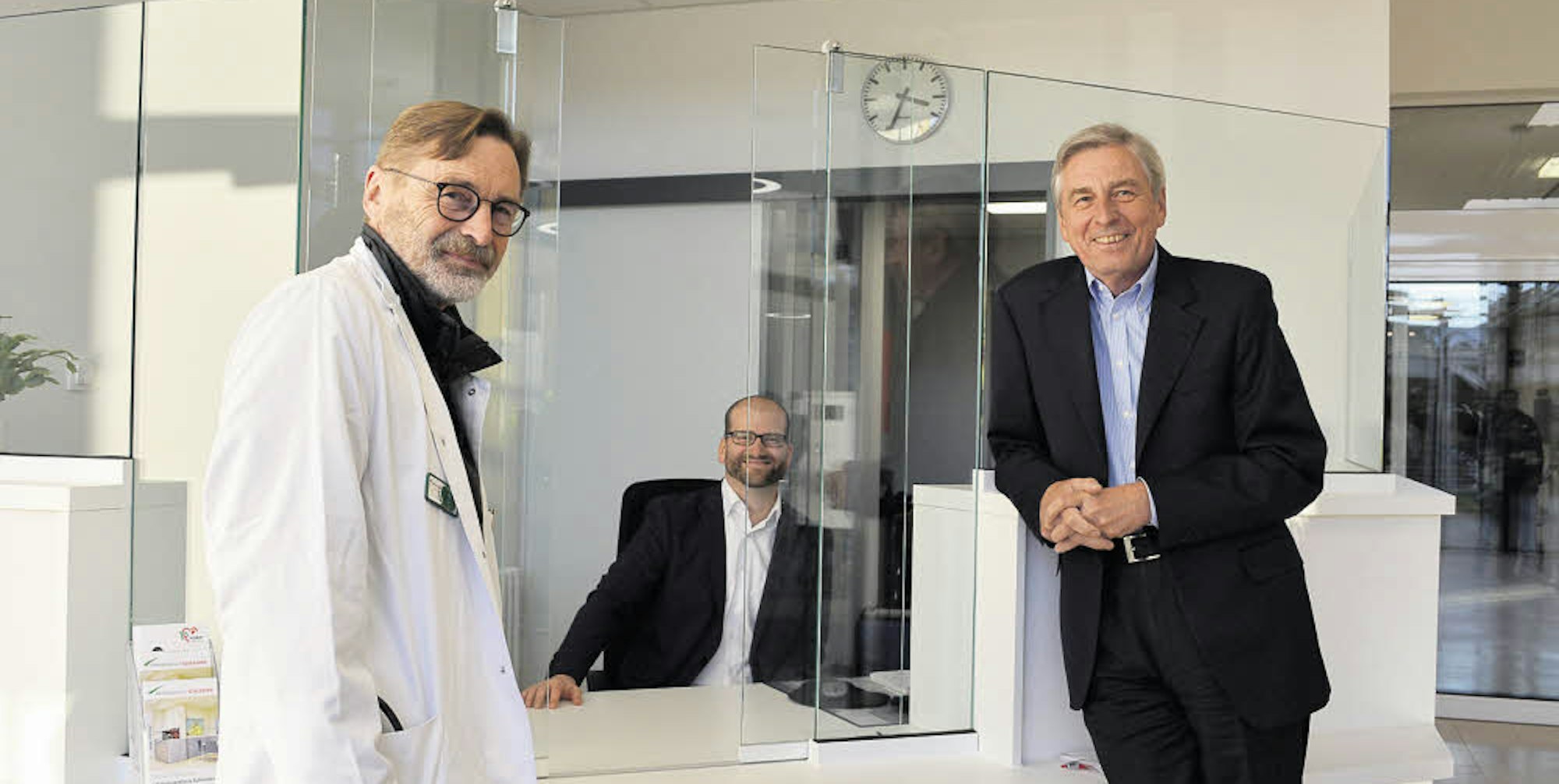 Recht modern wirkt der Eingangsbereich des Schleidener Krankenhauses. Der ärztliche Direktor Dr. Gerald Vey (v. l.) , Einrichtungsleiter Michael Thurm und Manfred Herrmann, Geschäftsführer der Kreiskrankenhaus Mechernich GmbH, sind stolz auf die Renovierung.