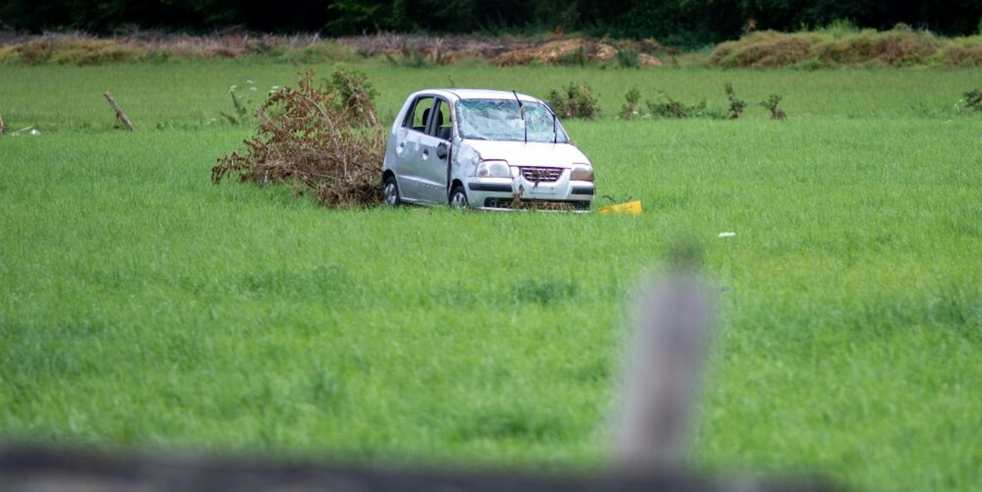 Dieses Auto steht mitten auf der Weide. Das Wasser hat es dorthin gespült.