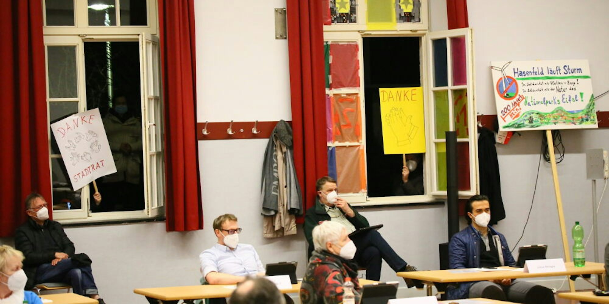 Danke, Stadtrat: Für die Entscheidung zur Klage gegen den Bescheid des Kreises Düren gab es auch von draußen Applaus auf Plakaten.