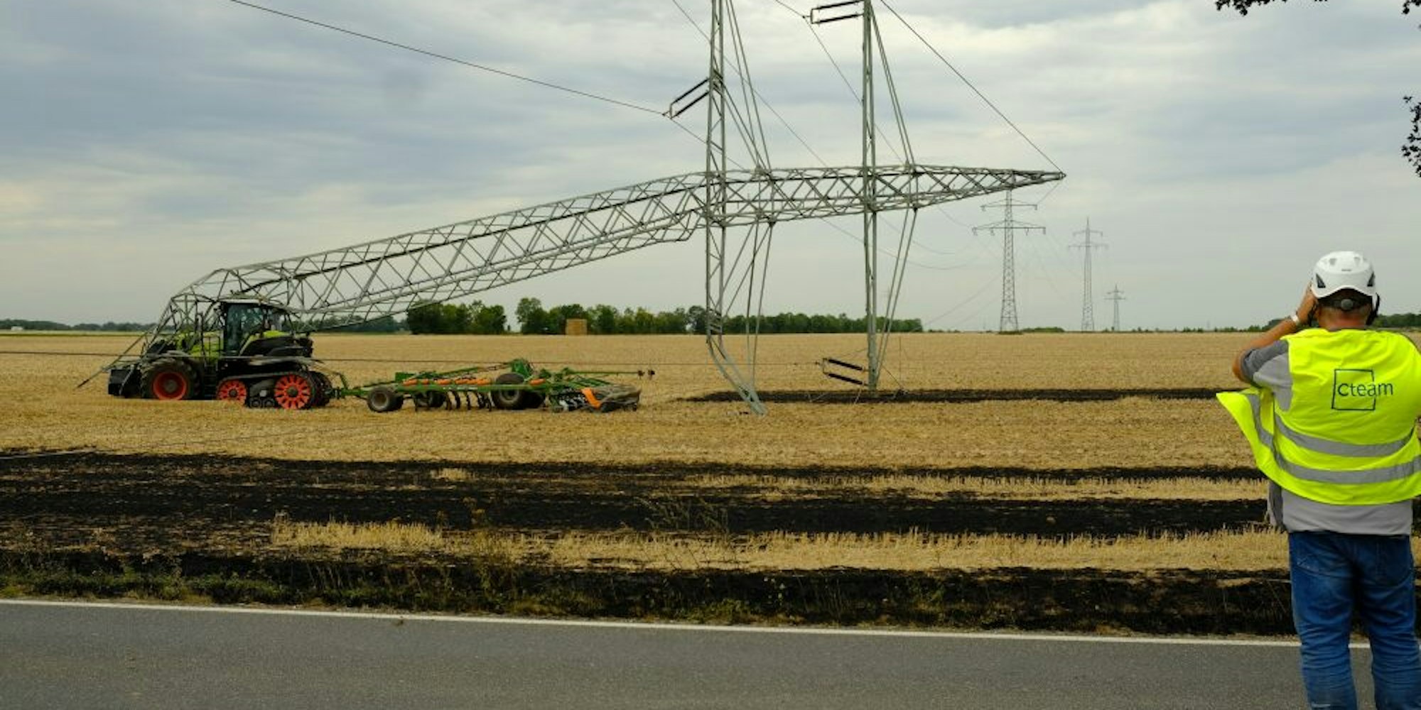 Gegen 11.15 Uhr war ein 16-jähriger Traktorfahrer aus dem Rhein-Sieg-Kreis bei Feldarbeiten nahe der K11 bei Klein-Vernich mit einem größeren Strommast kollidiert, der daraufhin abknickte und über den Traktor hinweg auf das Feld stürzte.