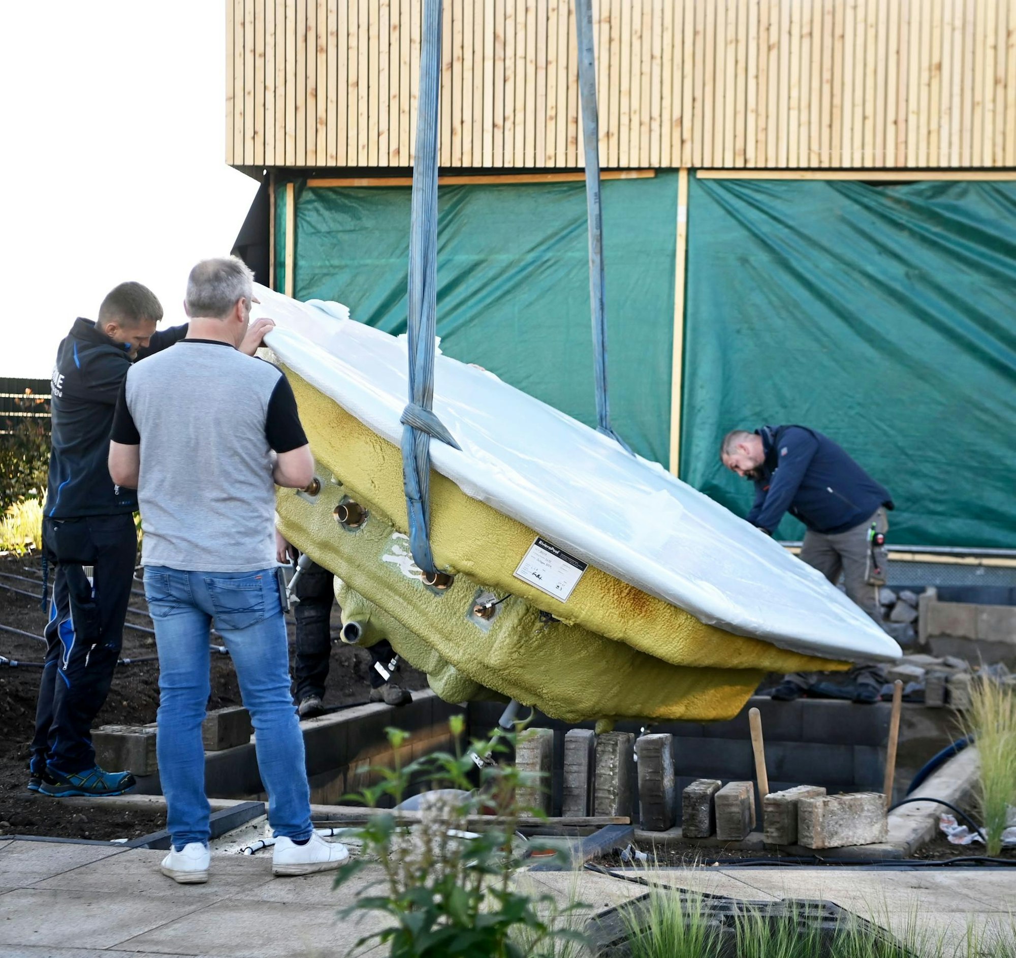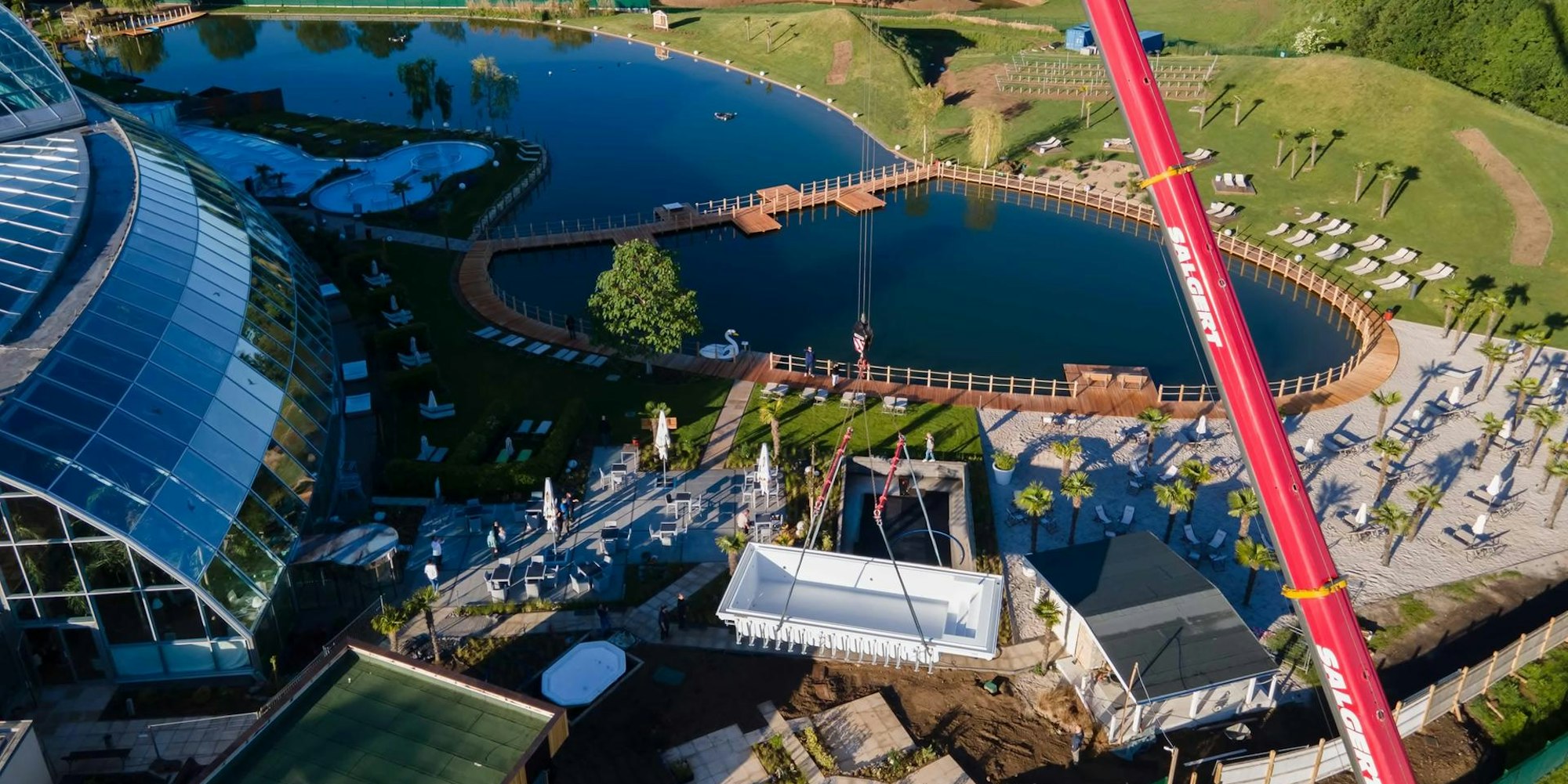 Der neue Außenpool schwebte am Haken eines Spezialkrans in die Badewelt in Euskirchen ein.