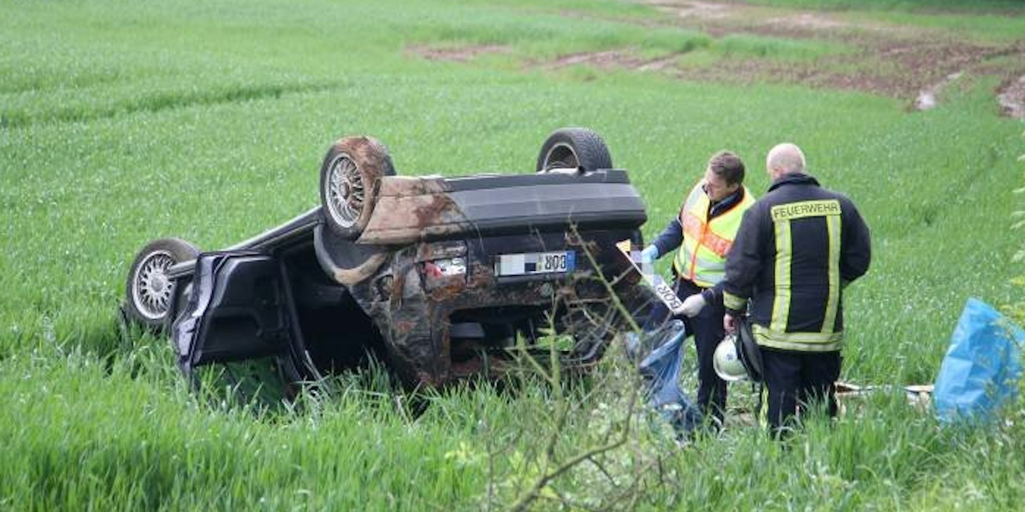 Daher ist noch unklar, wann sich das Unglück ereignet hat. Nach Angaben der Polizei waren die beiden Männer am Sonntag bei einer großen Familienfeier in der Breitenbendener Grillhütte zu Gast. Gestern Morgen entdeckten zwei 16 Jahre alte Schüler aus Kall, die im Bus zur Realschule Mechernich unterwegs waren, den Unfallwagen in einem Weizenfeld. Durch ihre erhöhte Sitzposition im Bus konnten die Jugendlichen den auf dem Dach liegenden Golf durch eine Lücke im Gebüsch erspähen.