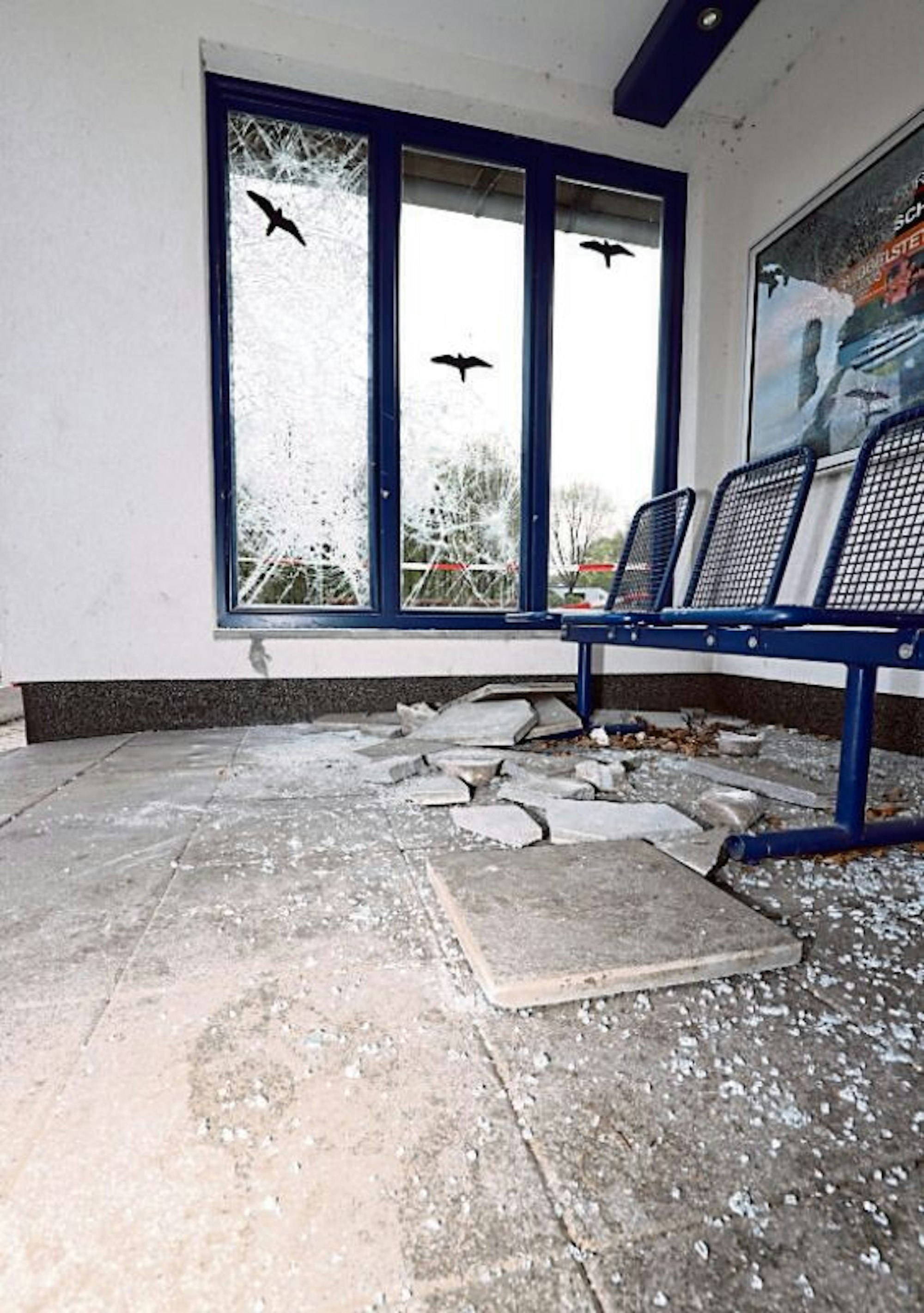 Im Toilettenhaus an der Bushaltestelle wurden die Glasscheiben mit Gehwegplatten eingeschlagen.