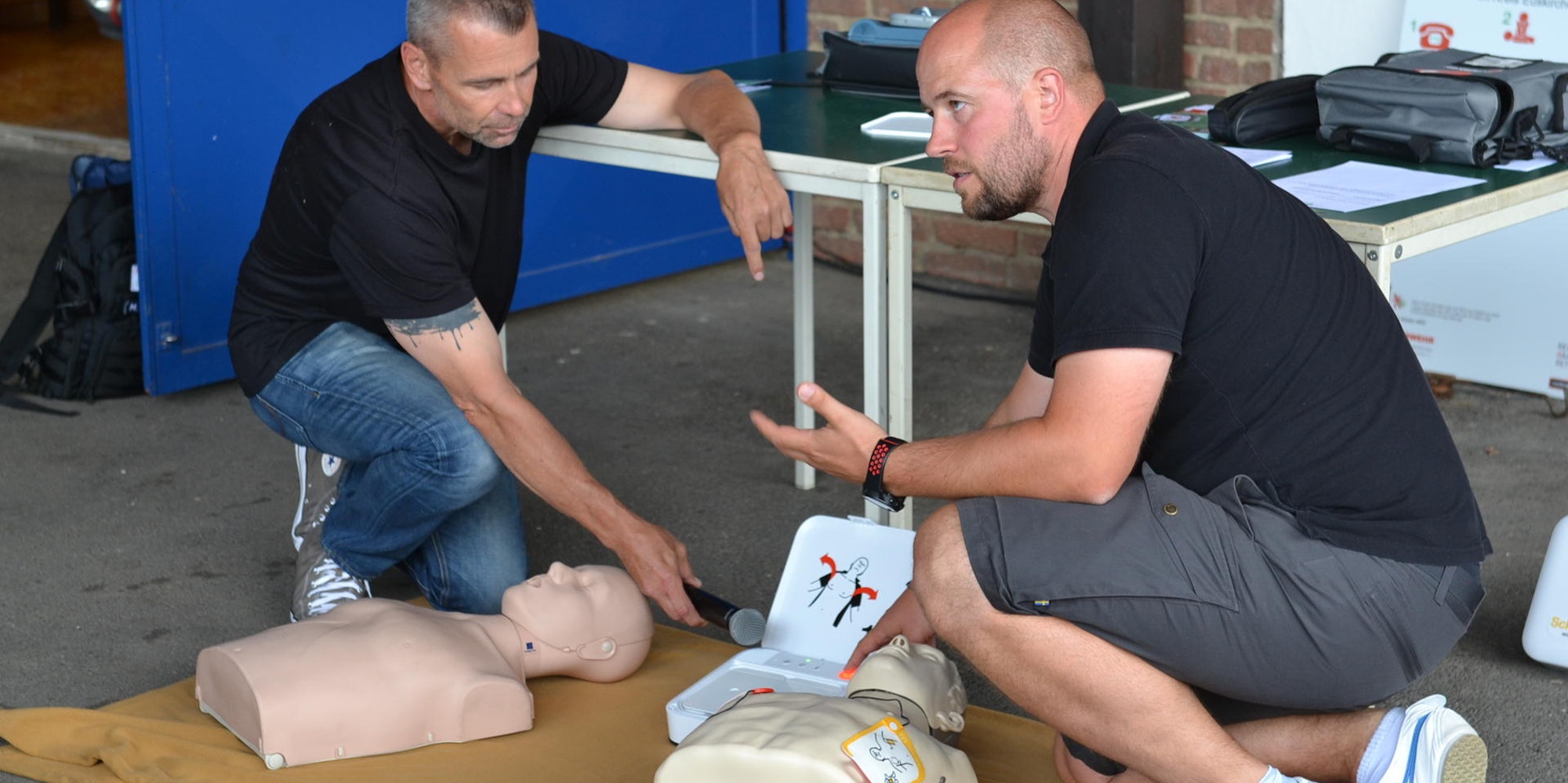 Anhand einer Übungspuppe präsentierten Thorsten König und Michael Gissinger (v.l.) den Umgang mit dem Defibrillator.