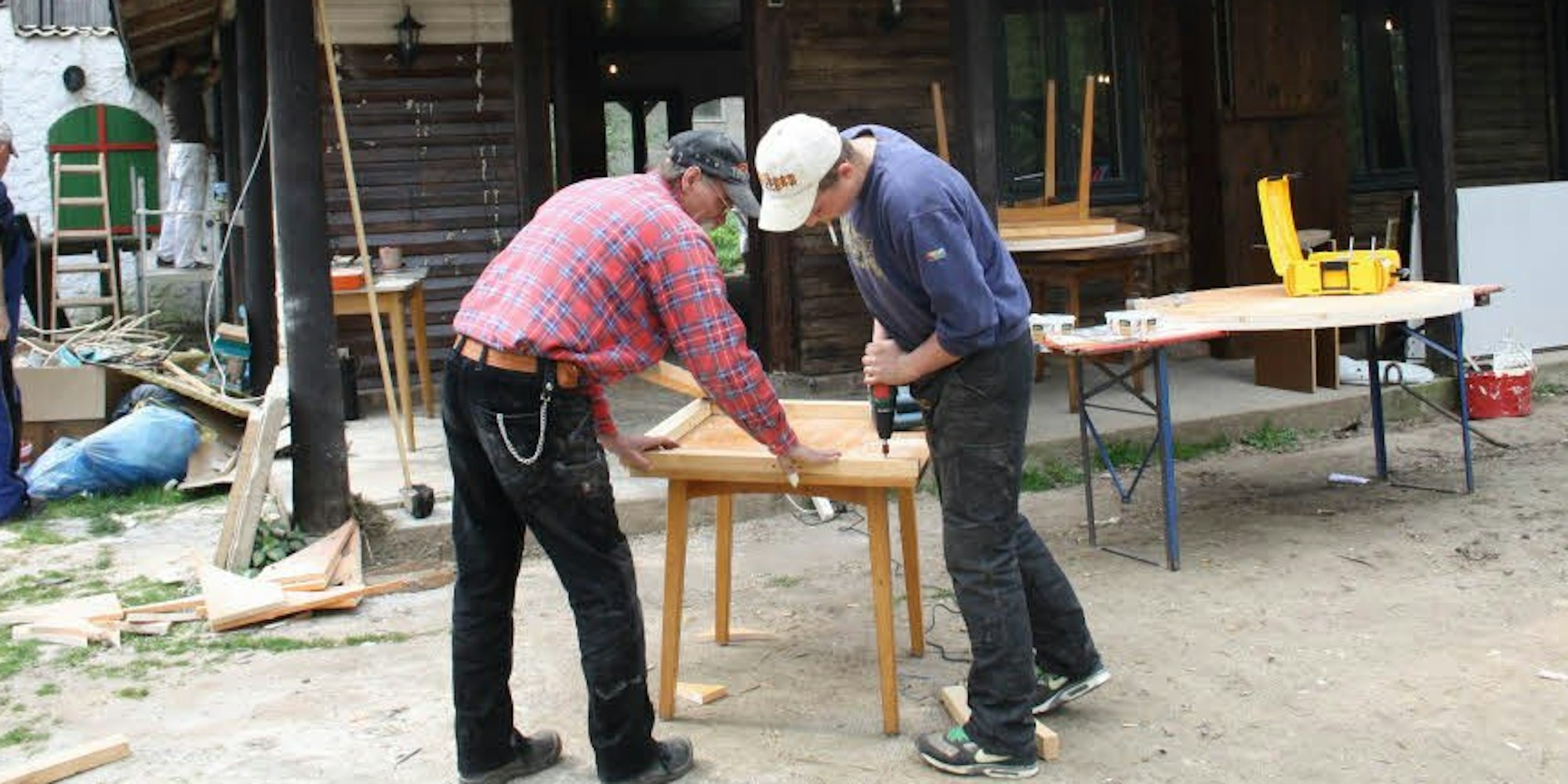 „Wir habe die Fenster erneuert, die Holzdecke ab- und wieder anmontiert, um die Stromleitungen verlegen zu können. Der Ofen wurde erneuert und die Bodendielen mussten, wie auch Teile der Wände, erneuert werden“, berichtet Walter Milz. Auch die Platten der runden Saloon-Tische werden selbst geschreinert und auf alte Tische aus einem Kindergarten befestigt.