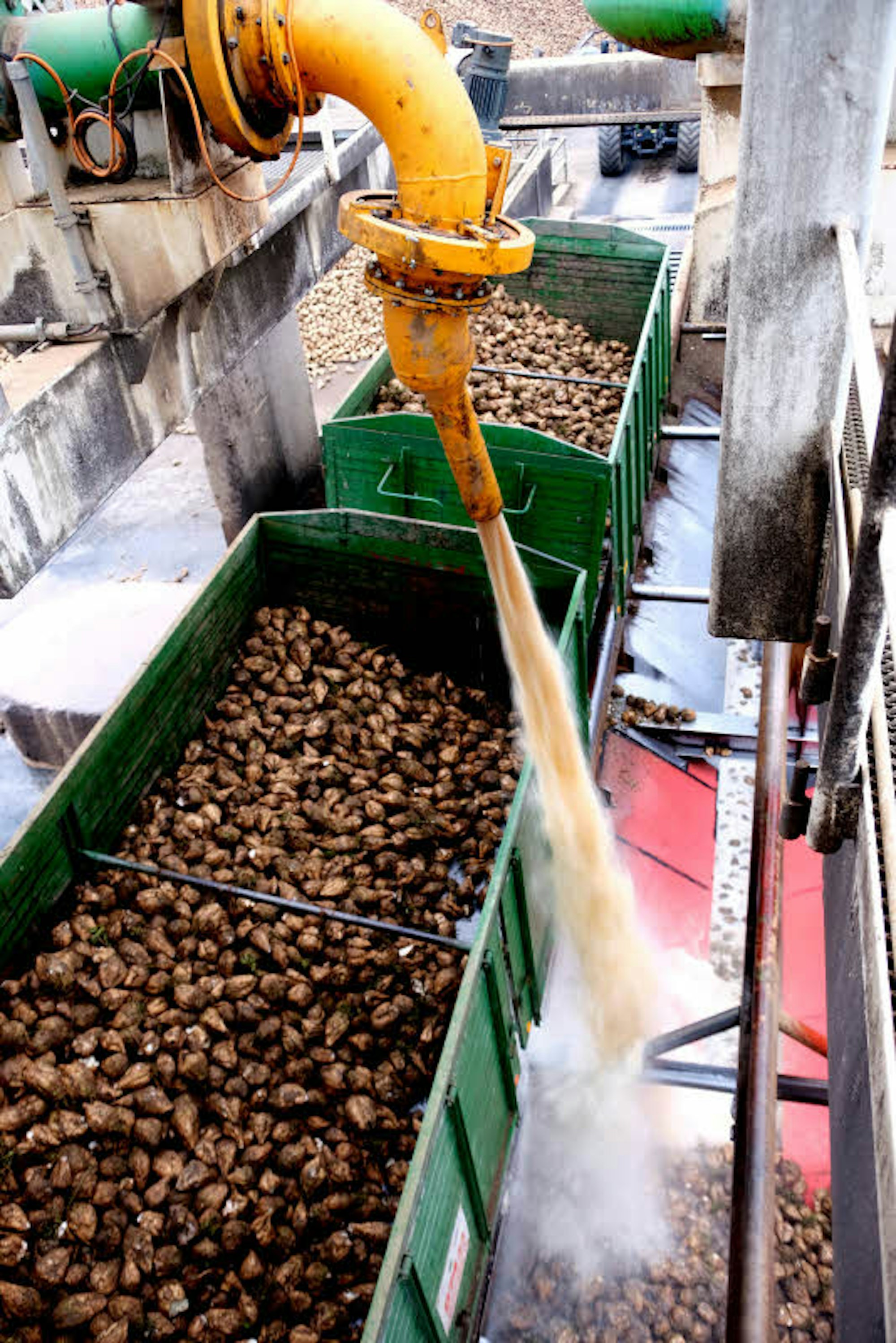 Ein Wasserstrahl spült die Rüben von Transportanhängern, die nur zur Seite abkippen können. Das geht fast im Minutentakt so.