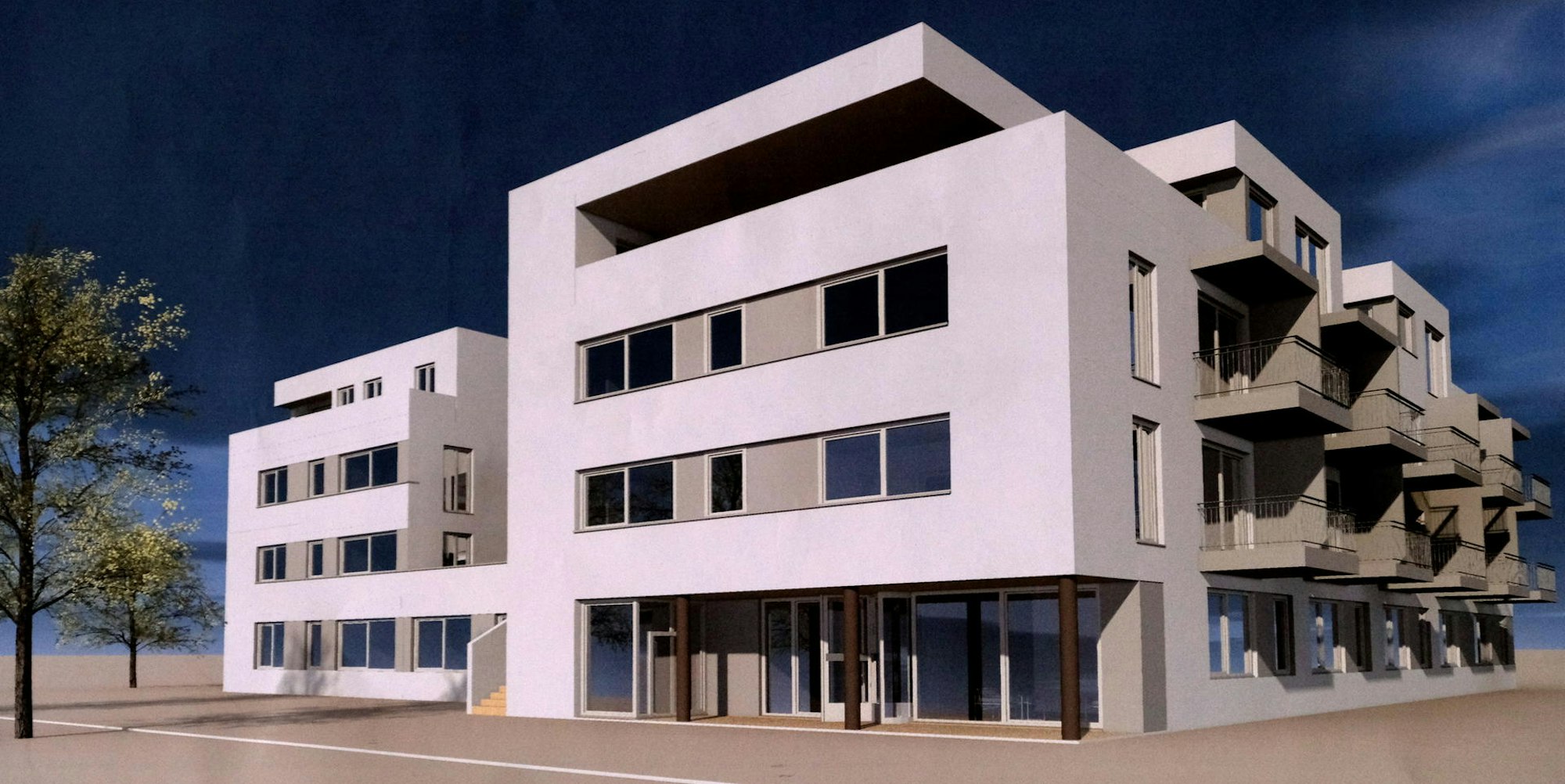 So soll die Bebauung des Stadthallen-Areals einmal aussehen. Über der Gewerbefläche im Erdgeschoss entstehen 26 Wohnungen.