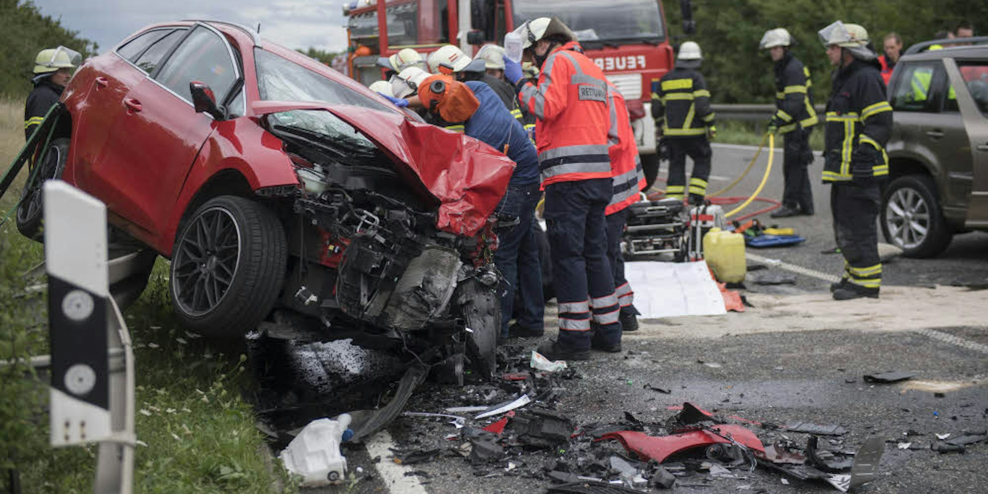 Die Wucht der Kollision war so stark, dass das Heck des Kia Ceed der Zülpicherin auf die Leitplanke geschleudert wurde. Die Euskirchener Feuerwehr befreite die Frau mit einer Sofortrettung, also schnellstmöglich, aus dem total zerstörten Kia.