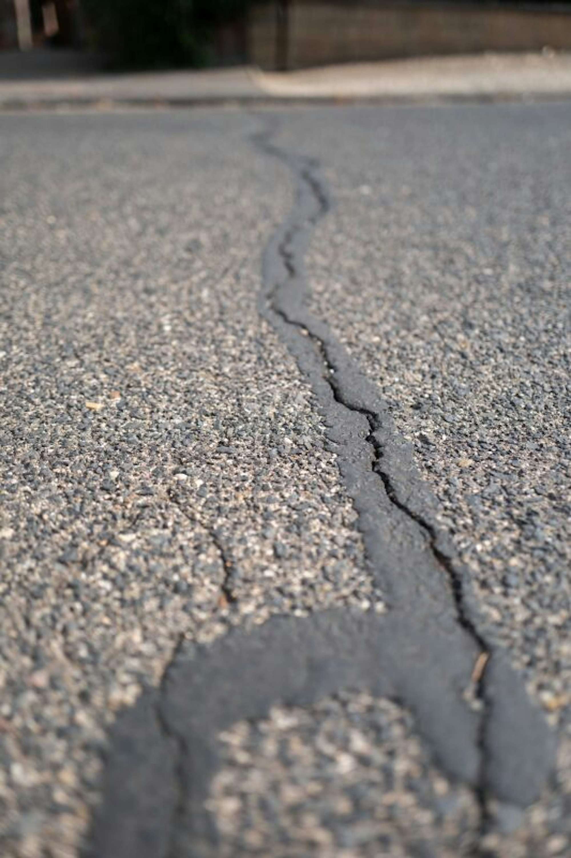 Der Asphalt ist geflickt worden und wieder gerissen.