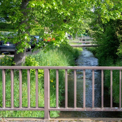 Durch die Bäume am Ufer ist der Rotbach nur zu erahnen. Um den Hochwasserschutz zu verbessern, soll er verlegt werden.