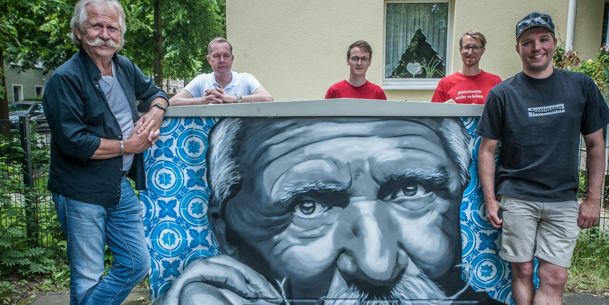 Leverkusen – Henning Krautmacher passte er ganz gut in den Kram, dieser Termin in seiner alten Heimat Schlebusch. „Freitags bin ich eh immer hier um minge Mamm zo besöke“, sagte er kölschelnd. Das sei perfekt. Und dieses „perfekt“ war überhaupt ein gutes Stichwort, denn: Krautmachers Konterfeit auf dem Verteilerkasten am Marktplatz , das zu begutachten er vorbeigekommen war aus seinem mittlerweile in Pulheim liegenden Domizil, ist nunmal perfekt gelungen: Der markante Zwirbelbart, die schelmisch blitzenden Auge, das von TV-Kameras schon zigfach eingefangene Lächeln – Jens Lagemann hat ihn, den Schlebuscher Jung, Sänger der Mundartband Höhner und Quasi-Paten des Stromkastens maximal gut getroffen.