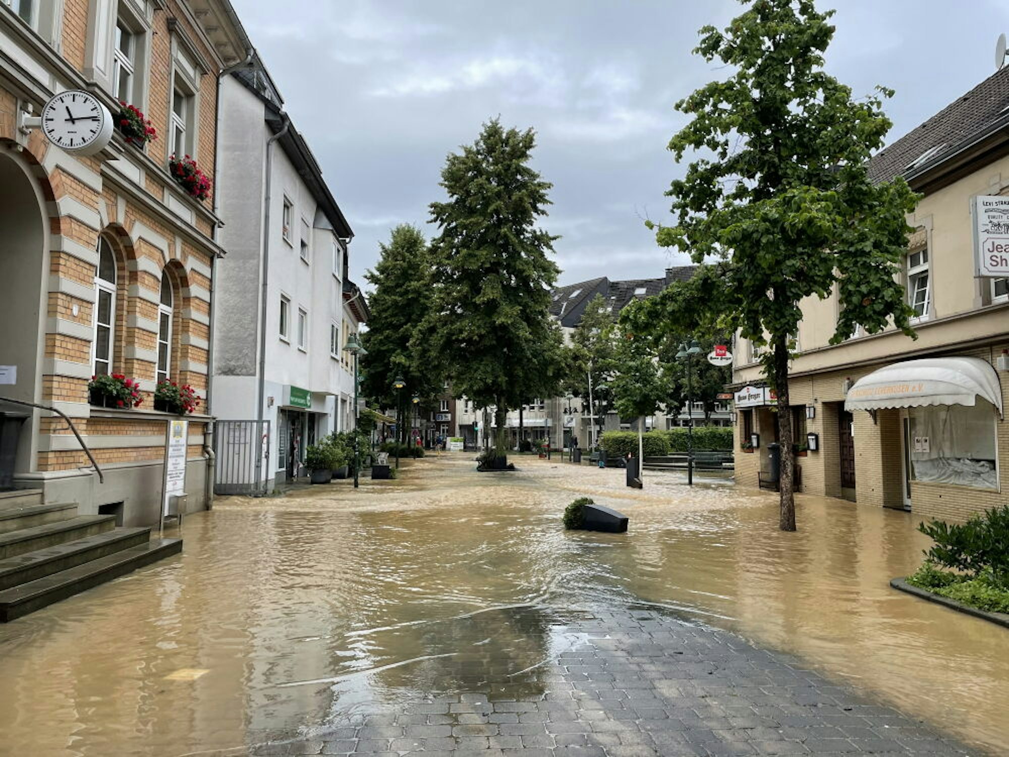 In der Opladener Realschule hat die Flut die größten Schäden angerichtet: Im Altbau stand das gesamte Kellergeschoss unter Wasser, im Erdgeschoss stand es 30 Zentimeter hoch. Betroffen sind neben den Fachräumen auch die Mensa und die Hausmeisterwohnung. Im 2003 errichteten Neubau stand der Keller vollständig unter Wasser, das Erdgeschoss bis auf eine höhe von 1,60 Metern.