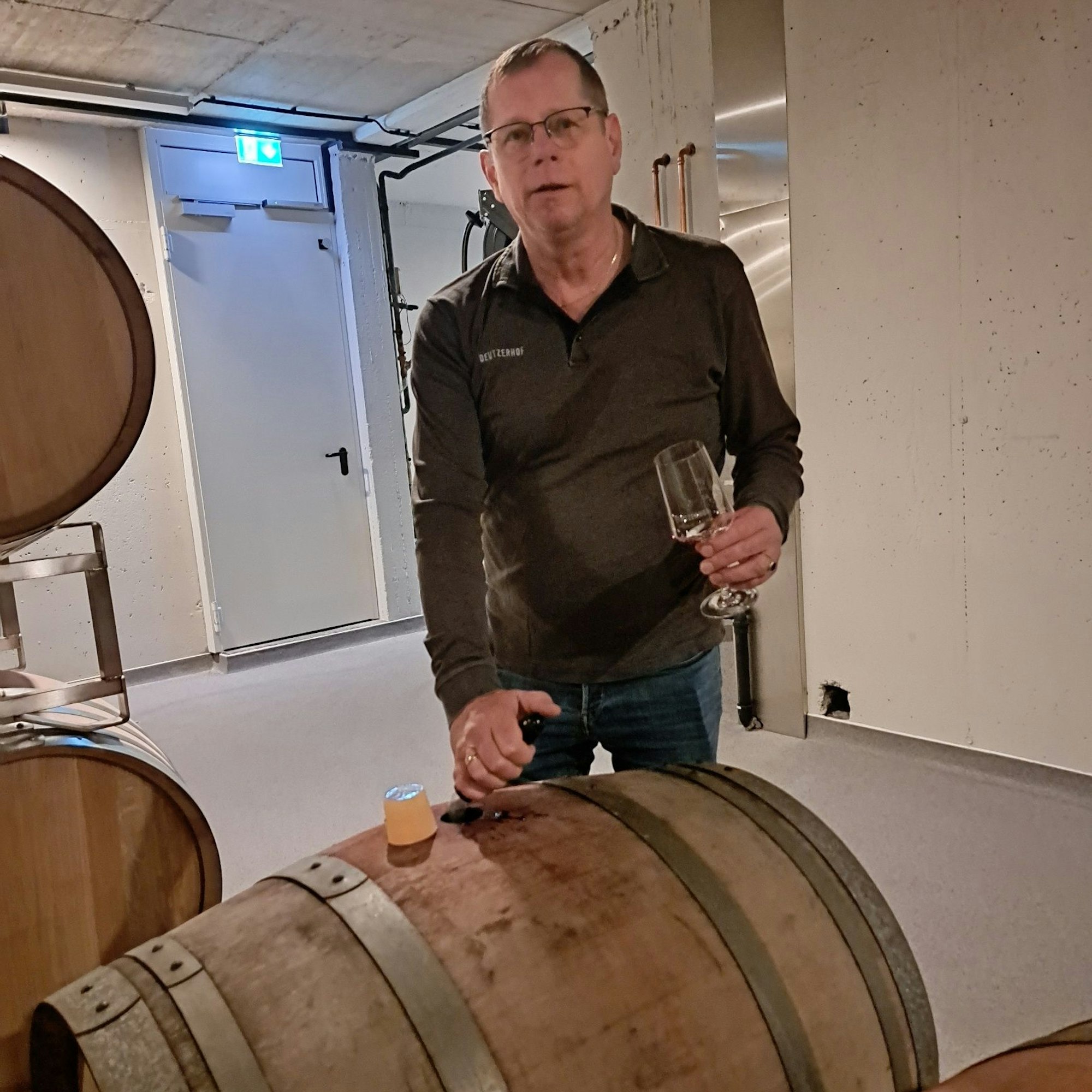 Kellermeister Hans-Jörg Lüchau zieht eine Probe im Fasskeller