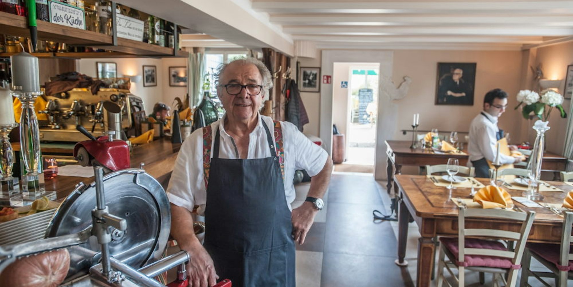 Ich weiß nicht, für mich ist das normal, alles so zu machen. Die Pasta machen wir zum größten Teil selbst, den Schinken schneiden wir frisch an einer original Berkel-Schneidemaschinen, die auch im Gastraum steht. Wir sind alle Italiener hier, einige sind schon seit Anfang an dabei, manchmal gibt es aber auch Wechsel. Der Spaghetti hier (zeigt lachend auf einen jungen Kellner, Anm. der Red.) ist erst seit vier Jahren da. Meine Tochter und der Enkel kommen auch manchmal vorbei und helfen, so machen wir das hier alles.
