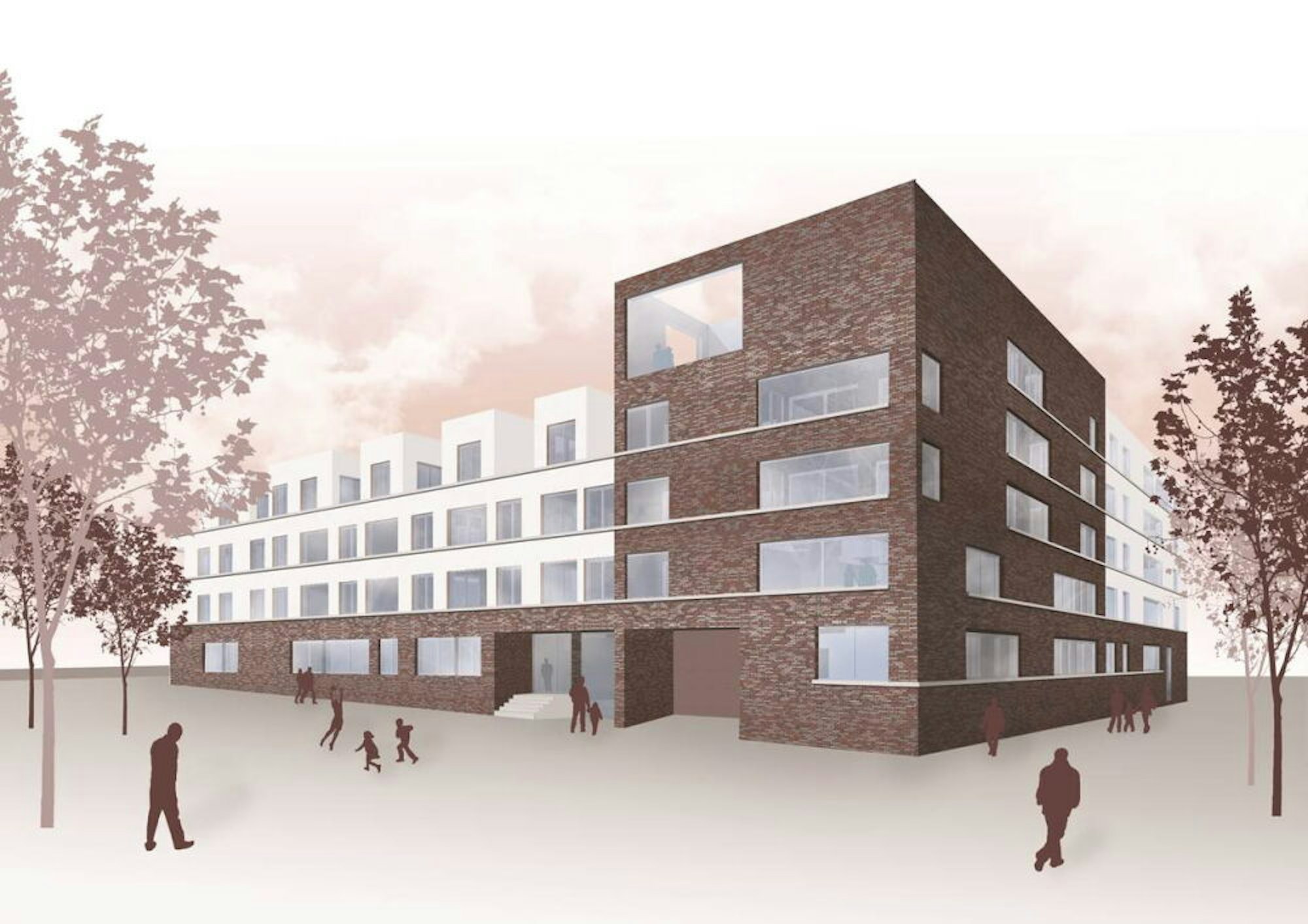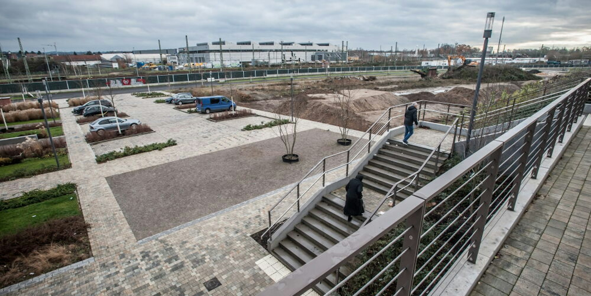 Unmittelbar neben dem neuen Henkelmännchenplatz soll rechts ein Wohnhaus mit Kita entstehen. In sechs Metern Höhe würd die Brücke zur Wilhelmstraße dort vorbeiführen.