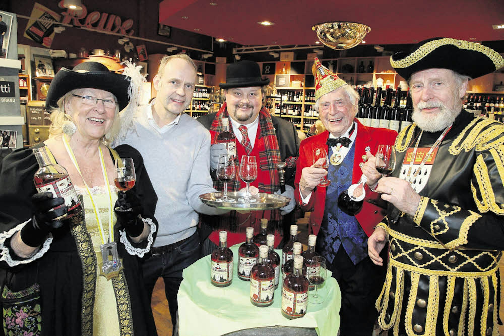 Feierten die Vorstellung des neuen Whiskeylikörs „Et Klimpermännche“: Cornelia Laufenberg, Markus Hetzenegger, Thomas Cüpper, Ludwig Sebus und Philipp Laudenberg (v. l.) im Edeka-Markt Hetzenegger in Sand.