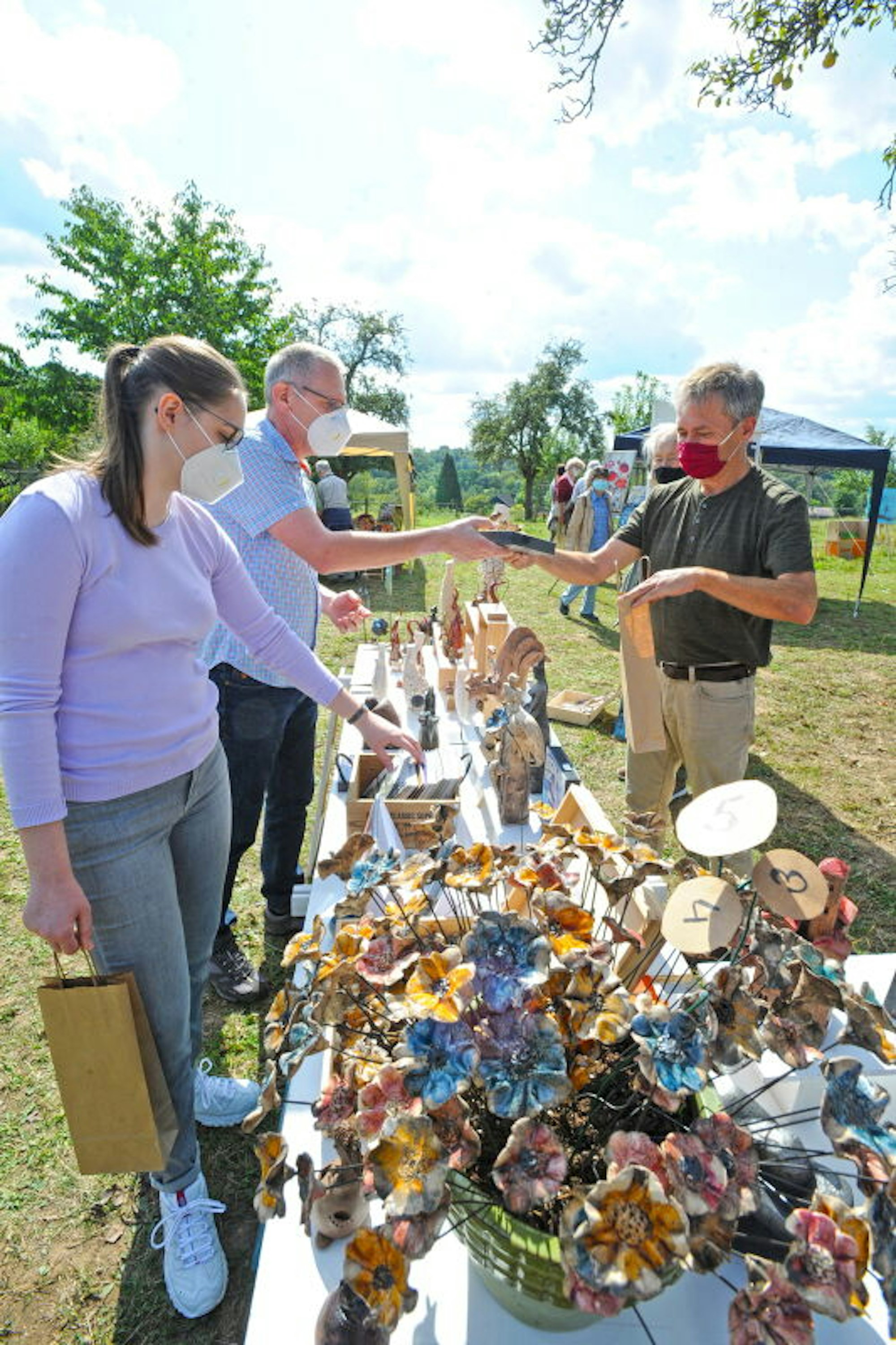 Der Kunstbasar unter freiem Himmel zwischen Obstbäumen erfreute am sonnigen Sonntag zahlreiche Besucher.