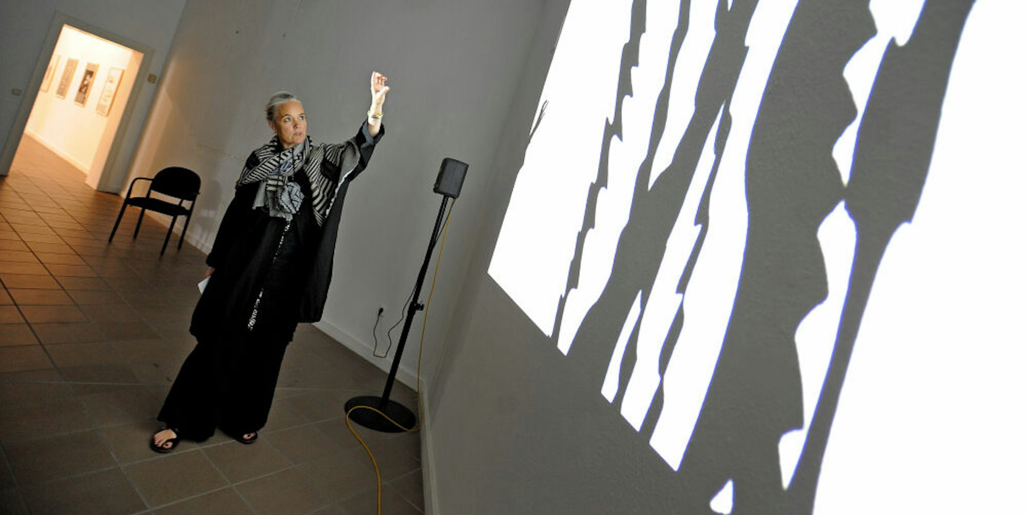 Animierte Formen: Kuratorin Susanne Wedewer-Pampus zeigt die Video-Installation in Volker Sauls Schau „Aftermath“.