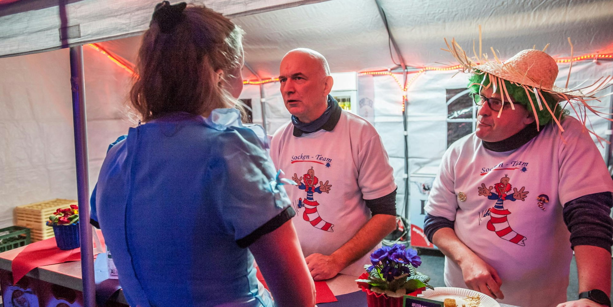 Gleich beim ersten Versuch klappt es. Ich habe mich für die Leichlinger Sockensitzung ins Kostüm geschmissen, doch das Blitzen der Kamera verrät mich vielleicht. Jürgen Taubert weiß sofort Bescheid, ruhig führt er mich am Ellenbogen hinter die Kulissen, dort, wo das Buffet für die Künstler unter Klarsichtfolie wartet. Er erzählt mir, was nun folgen würde: Er würde mir anbieten, die Polizei zu rufen, oder ein Taxi.