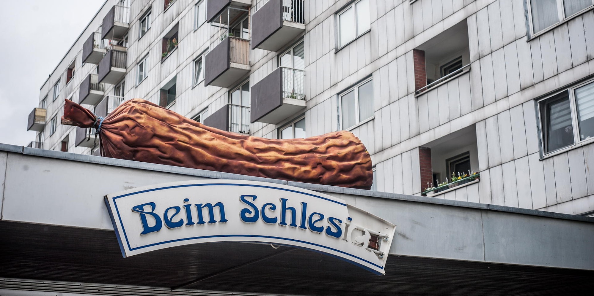 Leverkusen – Wer das Haus am Königsberger Platz 8 einmal gesehen hat, vergisst es nicht: Eine große Werbe-Wurst liegt auf den vorgelagerten Pavillons, dahinter erhebt sich die vielleicht am meisten verwahrloste Fassade Leverkusens in schmutzigem Asbest-Grau.