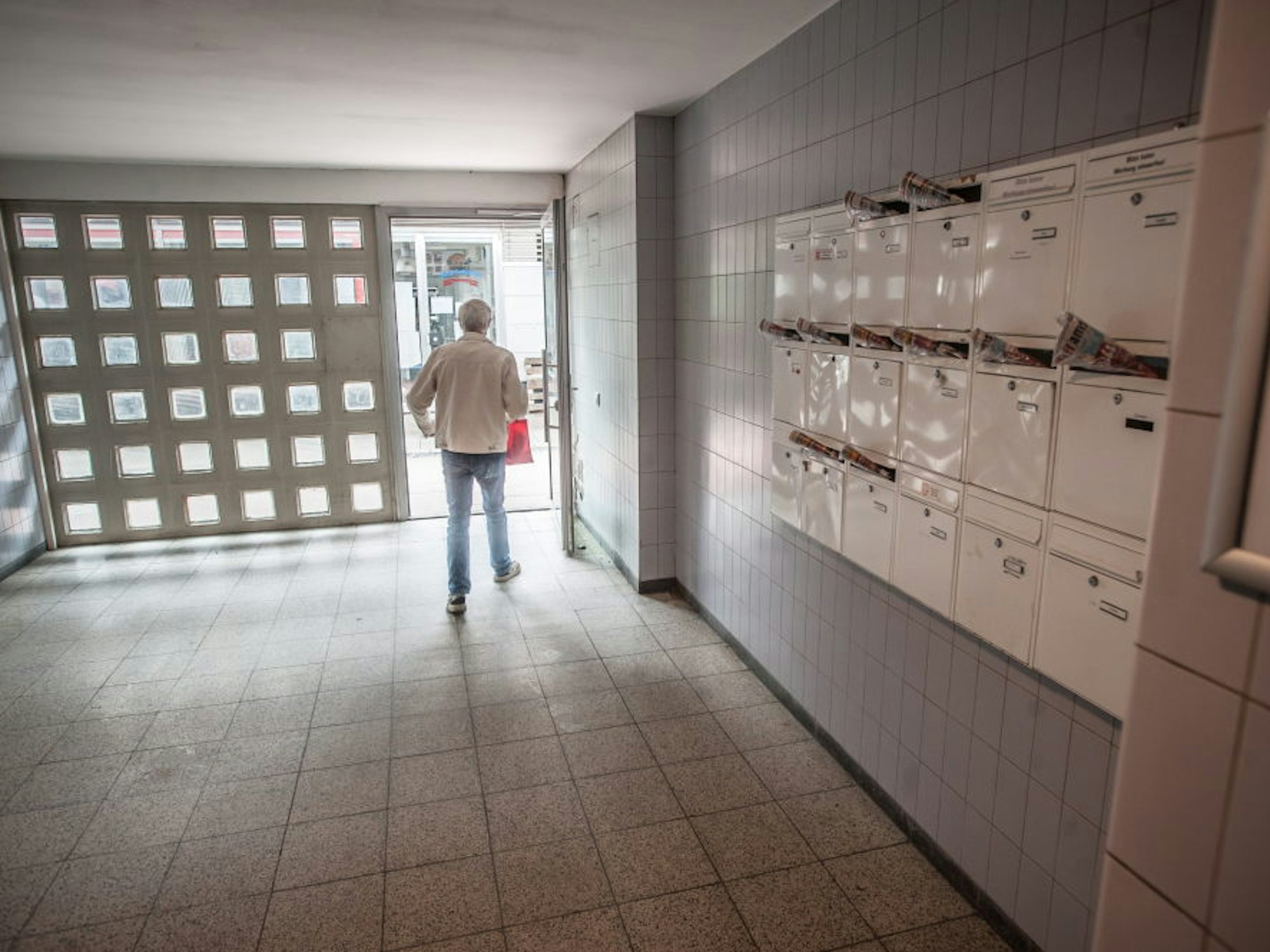 Die Besitzerwechsel kann er nicht mehr nachhalten. Als Mieter wisse man gar nicht mehr ganz genau, wem der Block jetzt gehöre. „Das ist alles ein einziges Kuddelmuddel hier“, sagt er. Das ganze Gebäude verkomme immer mehr, „ich rege mich so darüber auf, weil die von mir Miete haben wollen“. Als Beispiel nennt er die Eingangshalle, da stand nach dem Regen am Montag das Wasser ein paar Zentimeter hoch. Jetzt hätten ein paar Dachdecker da etwas gefrickelt, sagt der Handwerker. Richtig angegangen werde das Wasser-Problem jedoch nicht. „Hier muss dringend was passieren.“
