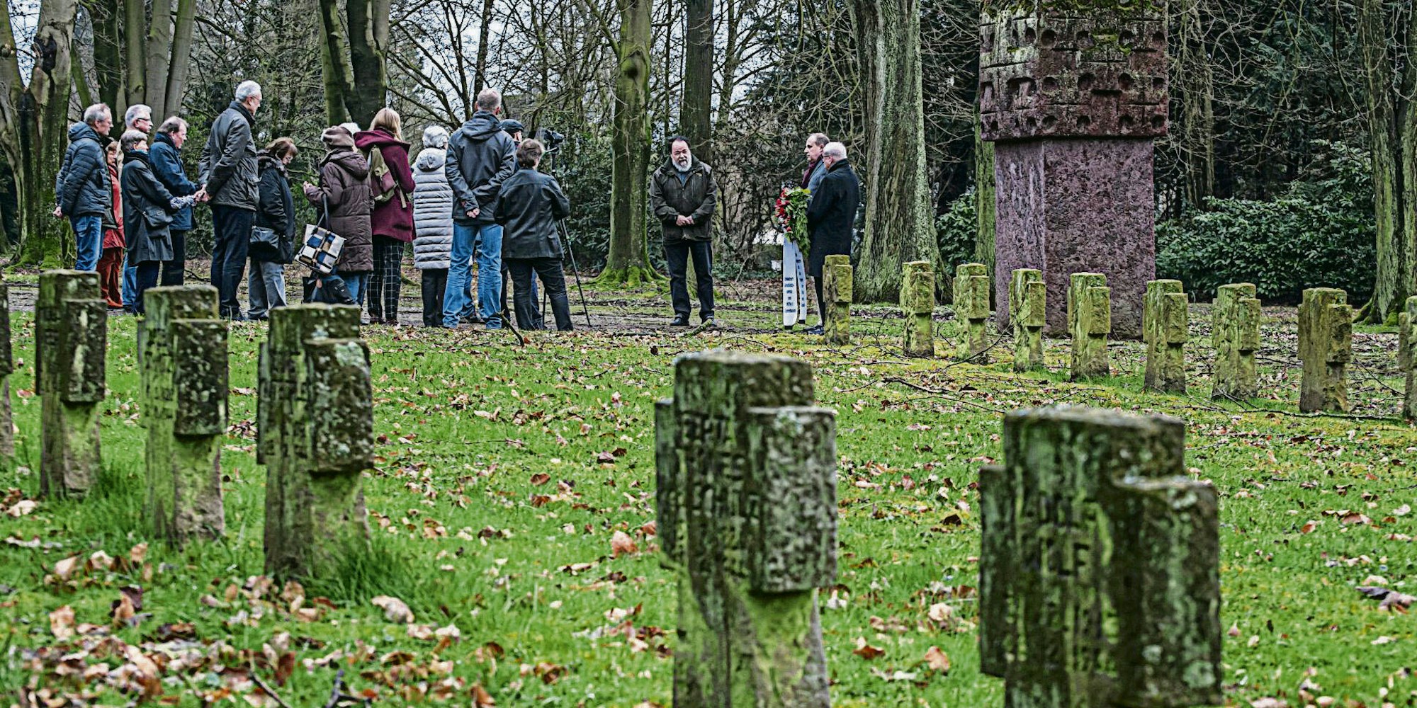 Der Geschichtsverein hatte daher am gestrigen Freitag anlässlich des 75. Jahrestags des Luftangriffs auf Opladen vom 6. März 1945 zur Kranzniederlegung auf den Ehrenfriedhof an der Rennbaumstraße geladen. Nicht, wie Leverkusens Bürgermeister Bernhard Marewski (CDU) mit Blick auf die wiederkehrende Kritik an Soldaten- oder Ehrenfriedhöfen betonte, „um den Krieg zu ehren, sondern die Menschen, die darin umkommen.“ Tatsächlich waren es hauptsächlich Zivilisten, insbesondere auch Zwangsarbeiter, die bei den beiden Angriffen im Dezember und März ihr Leben ließen.