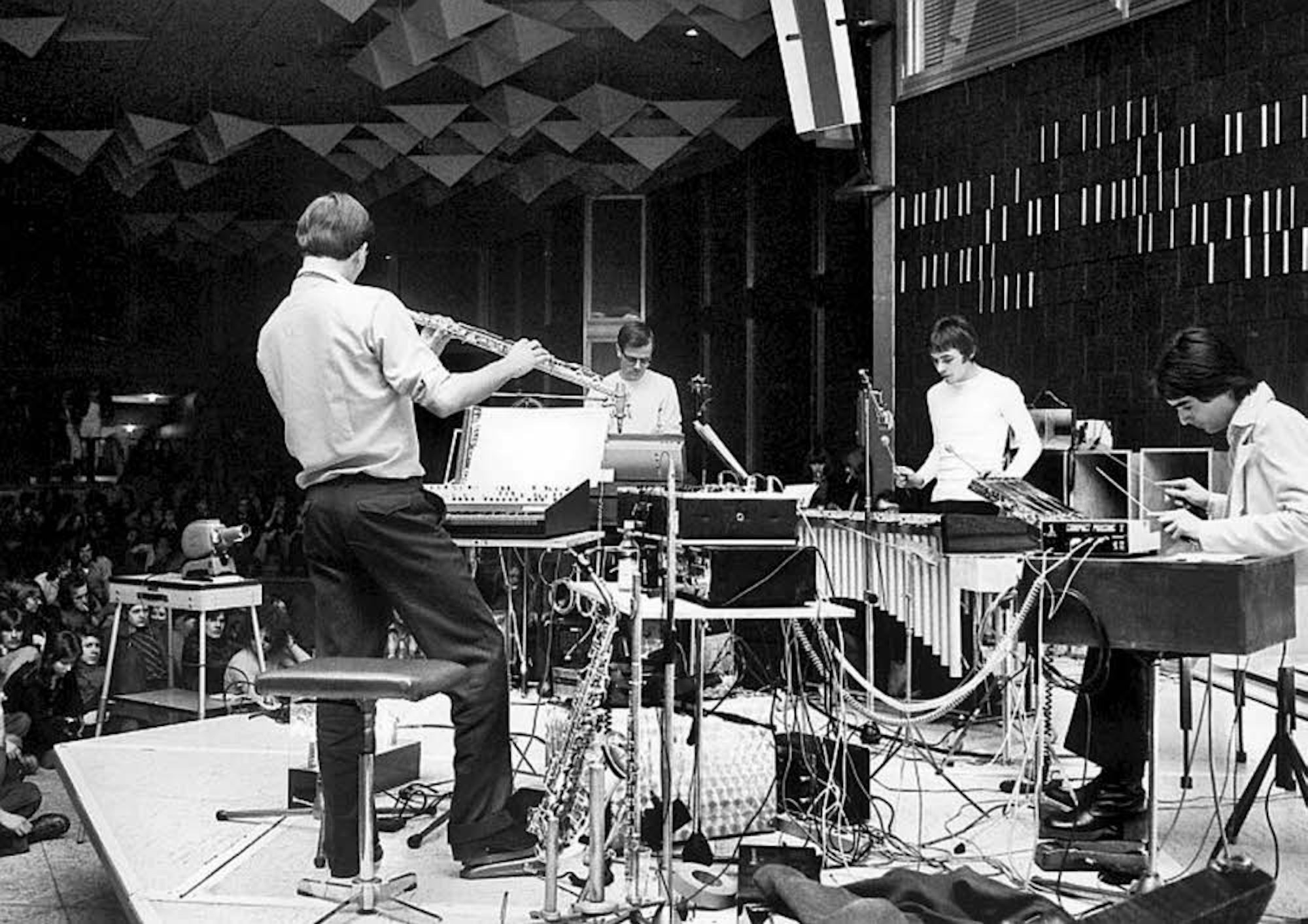 Wie gesagt: Genaue Erinnerungen daran habe ich zwar nicht mehr. Leider. Aber klar ist: Kraftwerk waren damals noch nicht die Band, die sie später wurden, sondern eher eine Band im Spannungsfeld zwischen Live-Elektronik, Jazz und alter deutscher Klassiktradition. Wir haben bei Konzerten wie dem im Forum mehr improvisiert als später – auch wenn ein Stück wie „Autobahn“ damals schon eine Struktur hatte. Was ich zudem mit Bestimmtheit sagen kann: Das Bild, das von diesem Konzert existiert, fängt diese freie Atmosphäre der damaligen Zeit, diese Ungezwungenheit, sehr gut ein. Schauen Sie es sich an: Diese Casual-Kleidung, dieser Studenten-Look bei den um die Bühne sitzenden Zuhörern im Saal. Das war damals eine ganz eigen organisierte, freie Kultur. Und die erkennt man auf dem Leverkusener Foto.