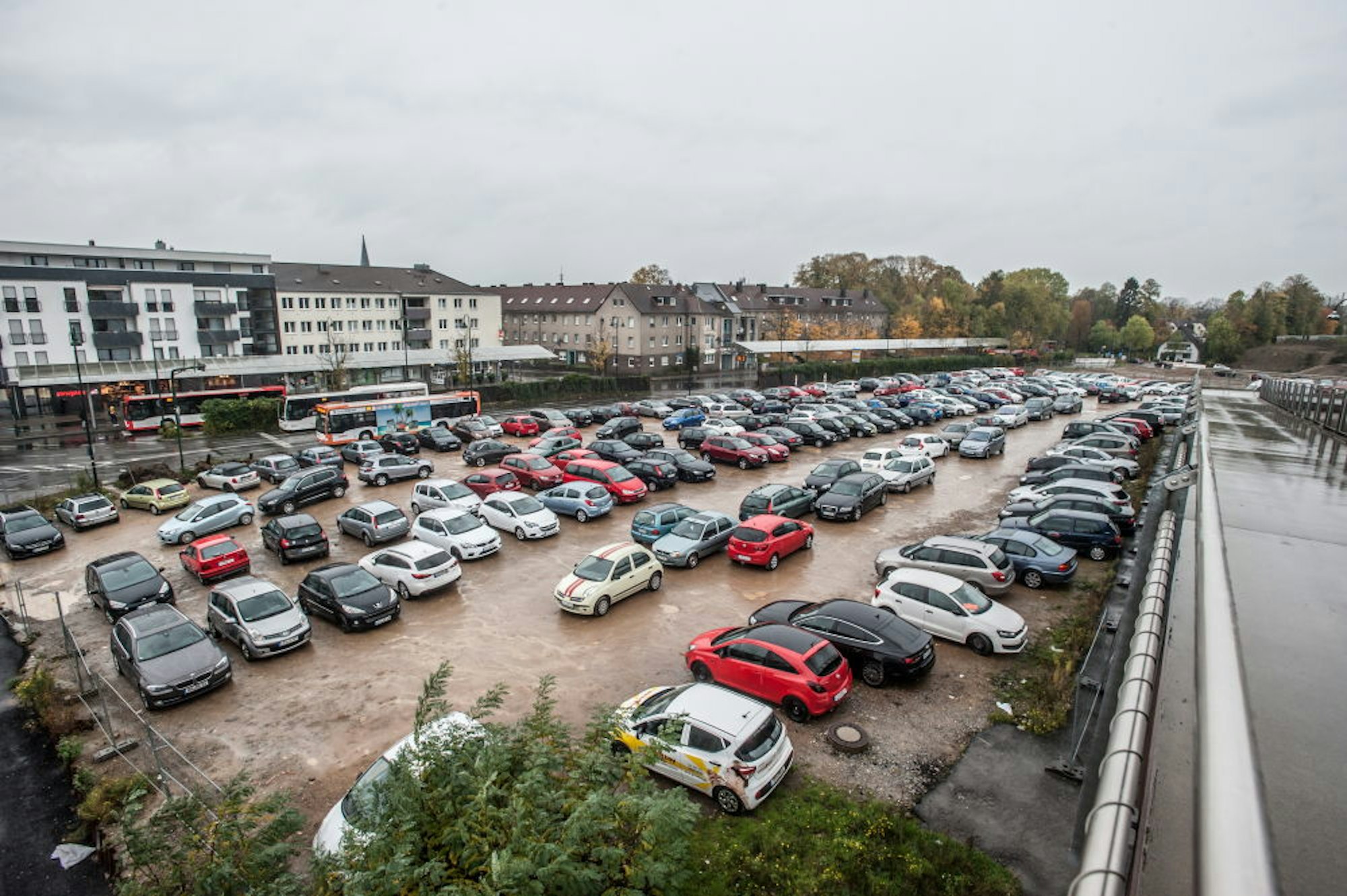 Autos, Autos, Autos. Der provisorische Pendlerparkplatz in Opladen könnte noch größer sein und wäre wohl dennoch ausgelastet.