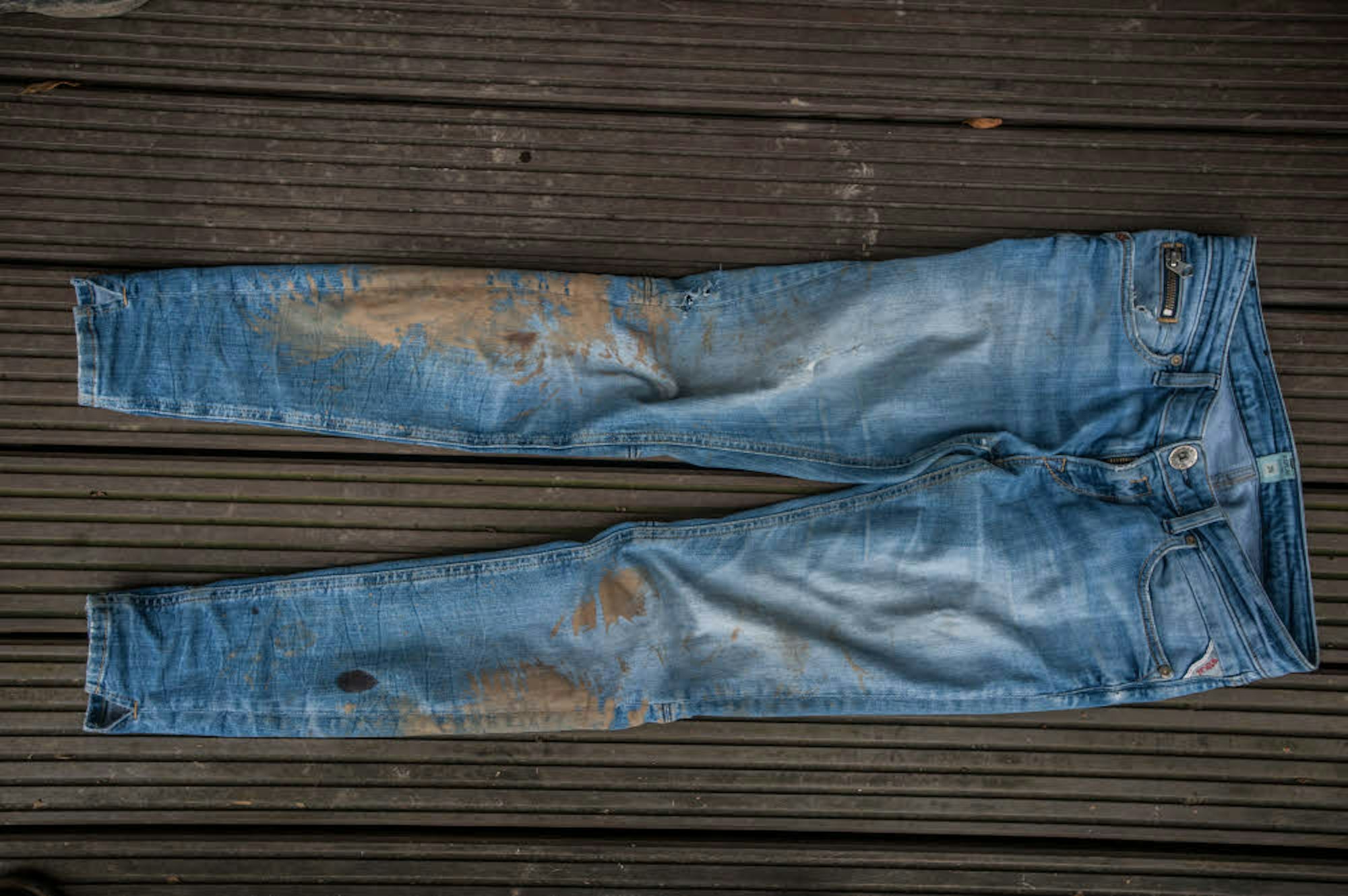 Die Hose vom Sonntagsspaziergang zeigt deutliche Spuren des Wildschweinangriffs.