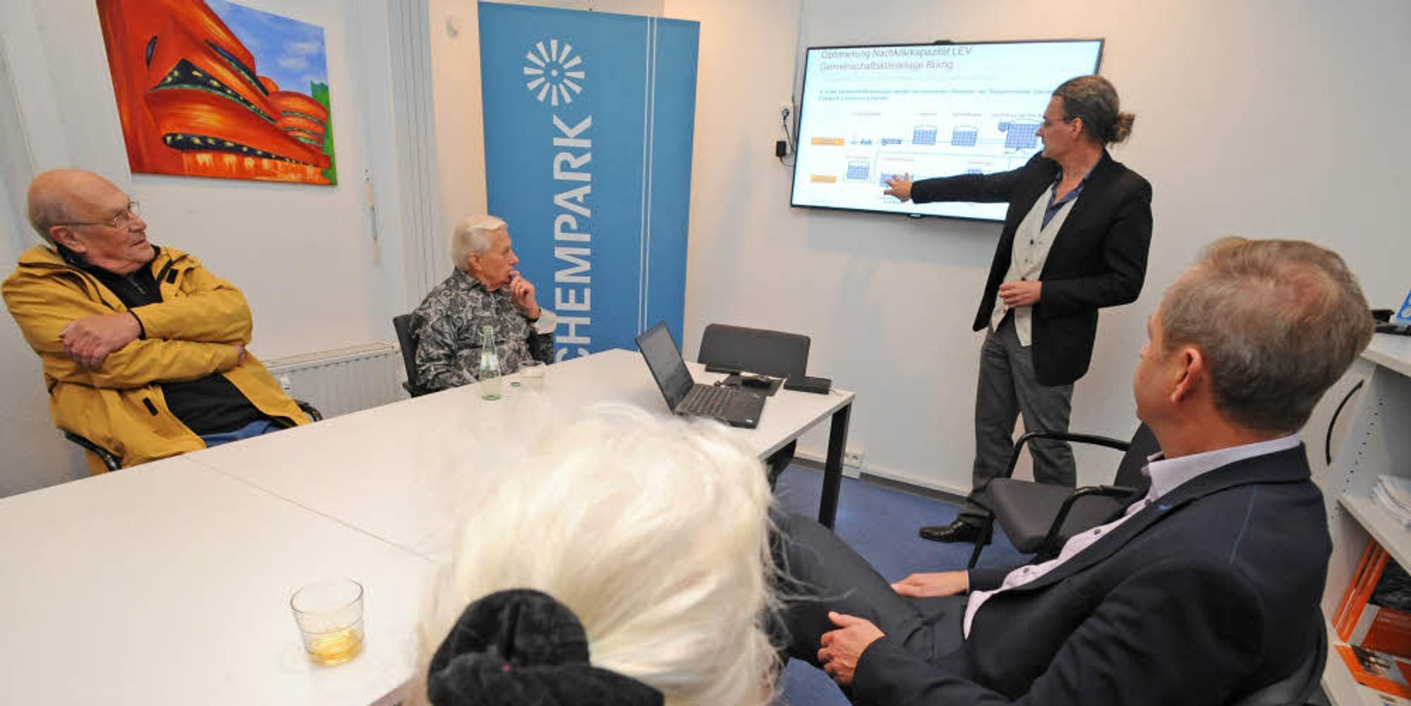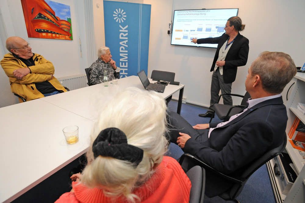 Klärwerk-Chef Robert Friebe erklärt Anwohnern aus Bürrig den Erweiterungsplan von Currenta in Bürrig. Ein neues Nachklärbecken soll die Anlage besser machen.