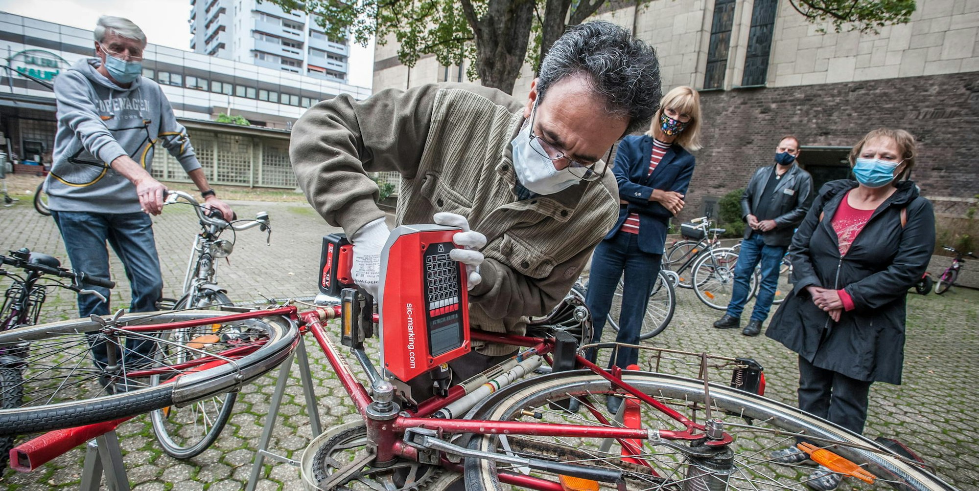 Heinz-Dieter Nelles vom Wiesdorfer Bikertreff ist Feuer und Flamme dafür, die Räder sicherer zu machen. Sein Team, das gebrauchte Fahrräder repariert und günstig an Bedürftige verkauft, finanziert sich nur durch Spenden, auch das neue Codiergerät konnte nur mithilfe einer 5000-Euro-Spende von Covestro angeschafft werden. Das Covestro-Stadtradel-Team um Andrea Wagner hatte 2019 eine Prämie gewonnen, die es gerne spenden wollte. Covestro stockte den Betrag noch mal auf.