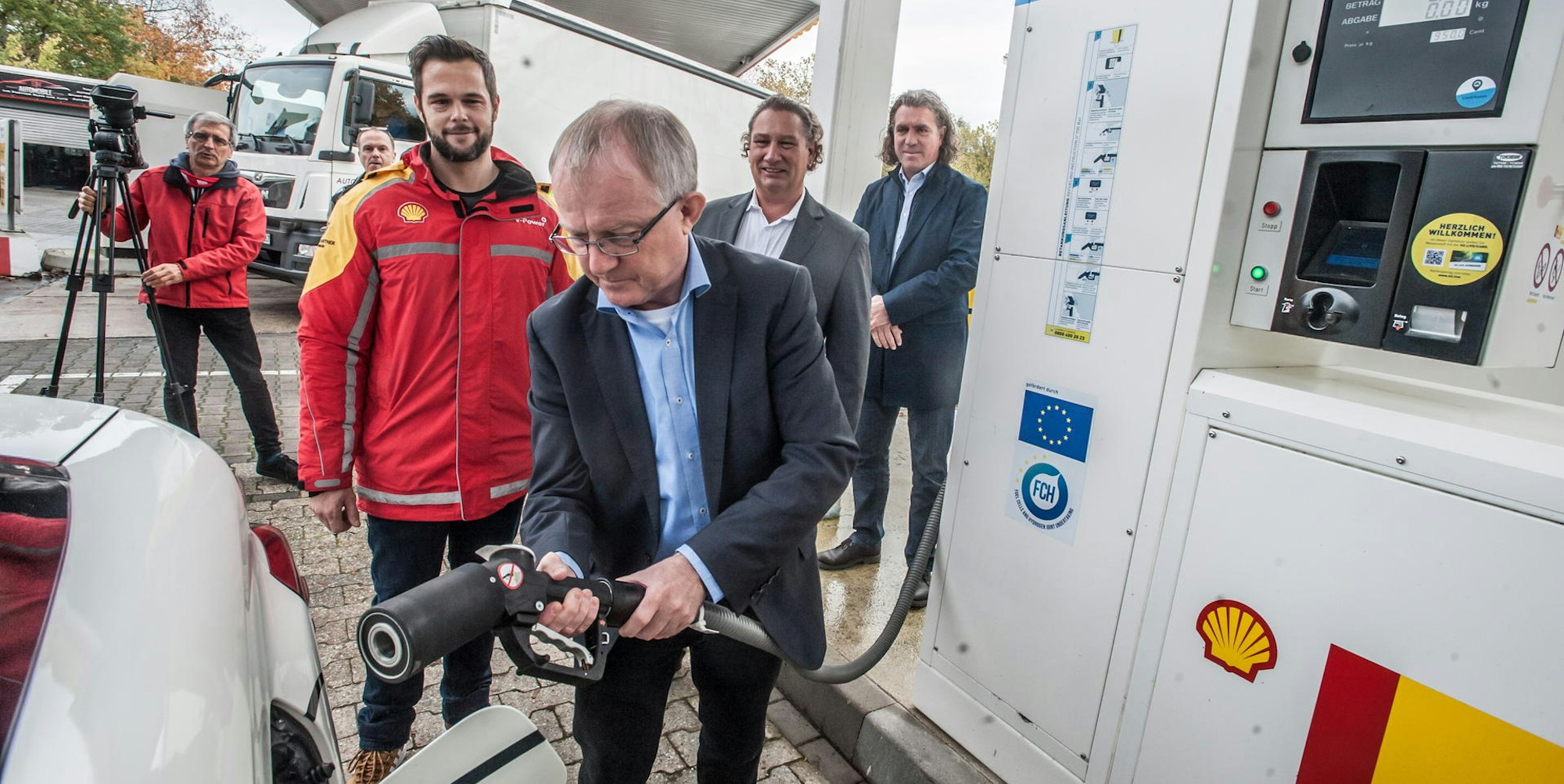 NRW-Abgeordneter Rüdiger Scholz tankt ein mit einer Brennstoffzelle betriebenes Auto an Leverkusens erster Wasserstofftankstelle.