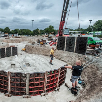 Das Pilzdach am Wiesdorfer Busbahnhof wird mit der PVC-Folie bespannt.