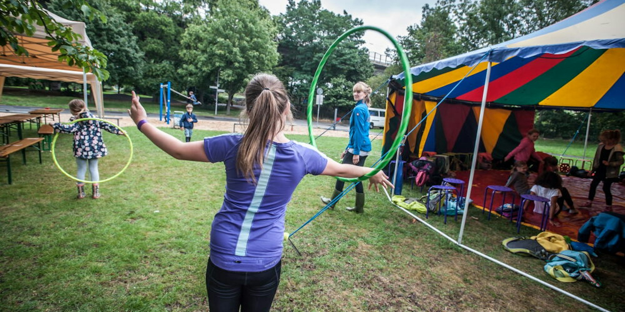 Akrobatik mit Hula-Hoop-Reifen oder lieber mit BMX-Rädern fahren? Im „Spielzirkus“ haben Kinder die freie Wahl.