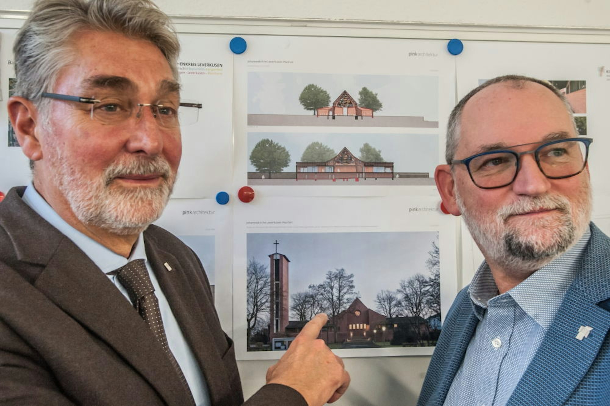 Superintendent Gerd-René Loerken und Verwaltungsleiter Michael Posthaus zeigen die ersten Pläne für die Johanneskirche.