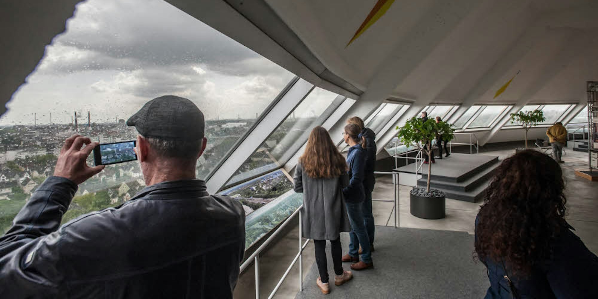 Arno Hölscher genießt die Aussicht aus rund 72 Metern über den Boden. Wer aus den Fenstern des EVL-Wasserturms schaut, der blickt einfach auf eine Miniaturwelt. Diese beeindruckende Aussicht eröffnet sich am Sonntag Hunderten Besuchern. Bereits um 12 Uhr werden 120 gezählt. „Als die Plattform vor etwa drei Jahren wieder eröffnet wurde, waren an einem Tag 800 Leute hier“, erinnert sich Hölscher. „Das hat natürlich auch mit dem Wetter zu tun.“