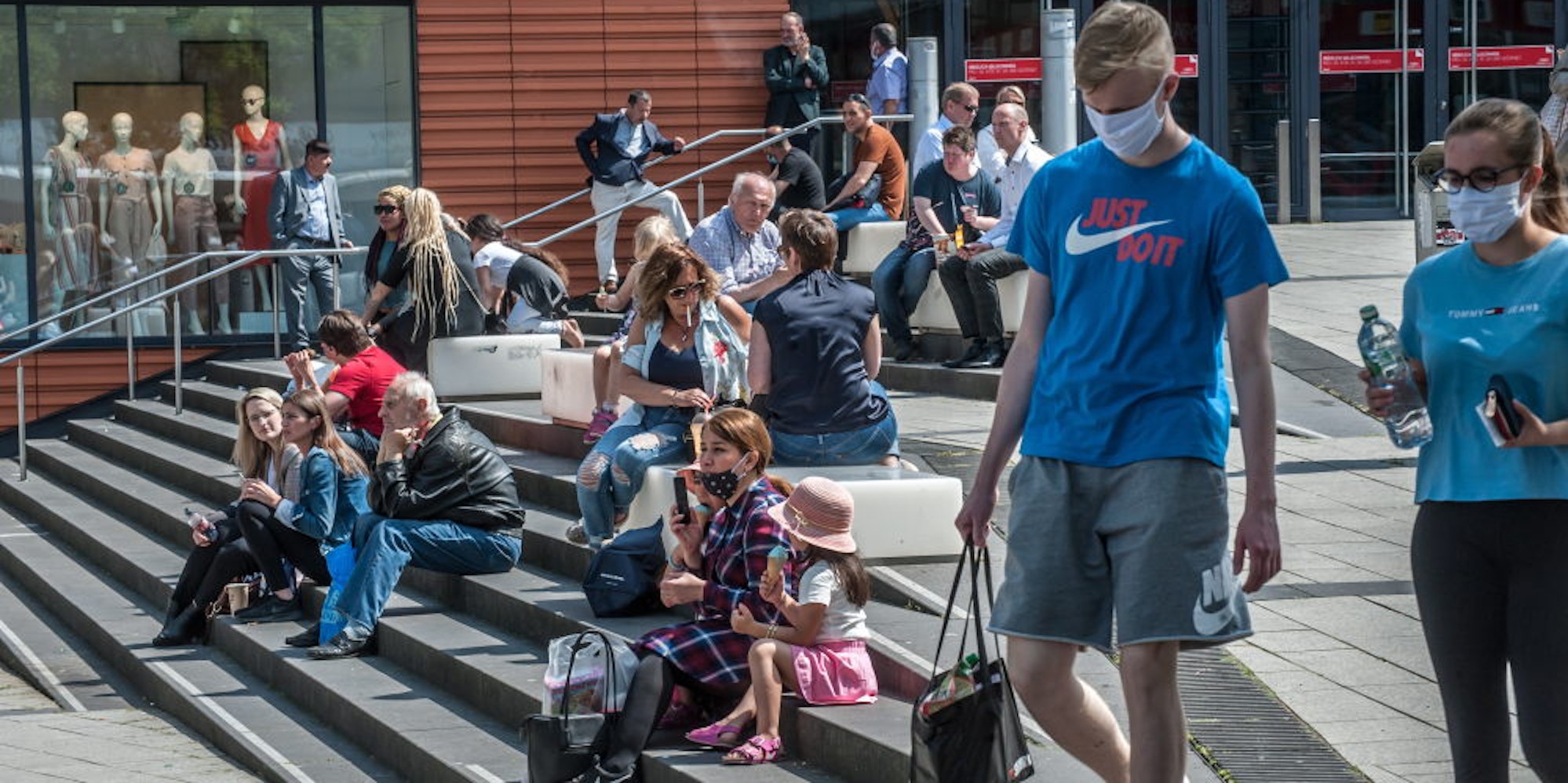 Buntes Treiben vor der Rathaus-Galerie in Wiesdorf. Am Sonntag wird es so vermutlich nicht aussehen, die Läden müssen zu bleiben. (Archivbild)