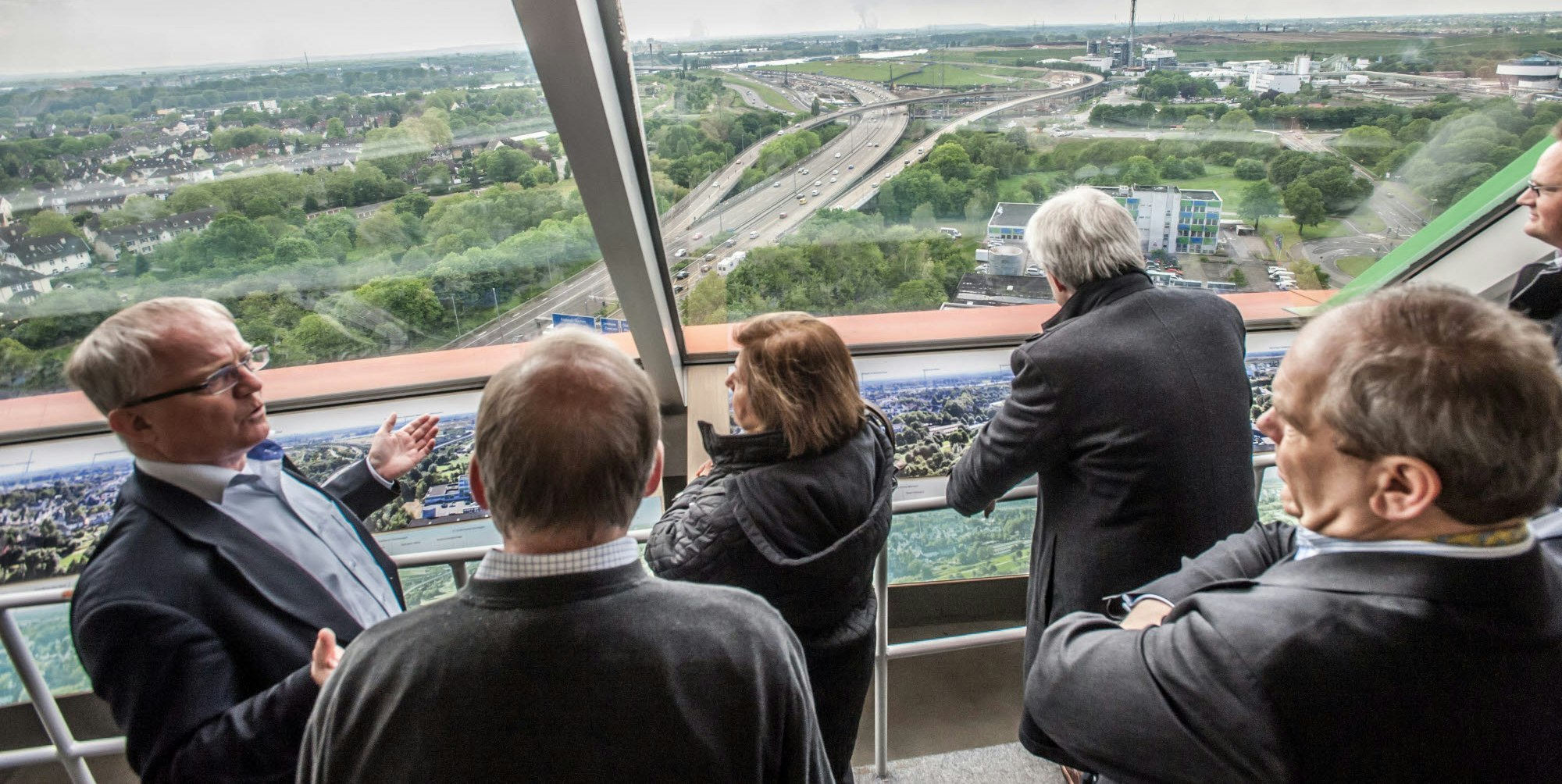 Von Leverkusens höchstem Gebäude aus erläuterte Scholz die Leverkusener Situation beim Autobahnbau, den sich der Stadtrat so weit wie noch möglich in Tunnellage wünscht. Beim Anblick von A1 und Leverkusener Brücke, umgeben von den Schloten der Industrieanlagen diesseits und jenseits des Rheins, zeigten sich die Christdemokraten beeindruckt.
